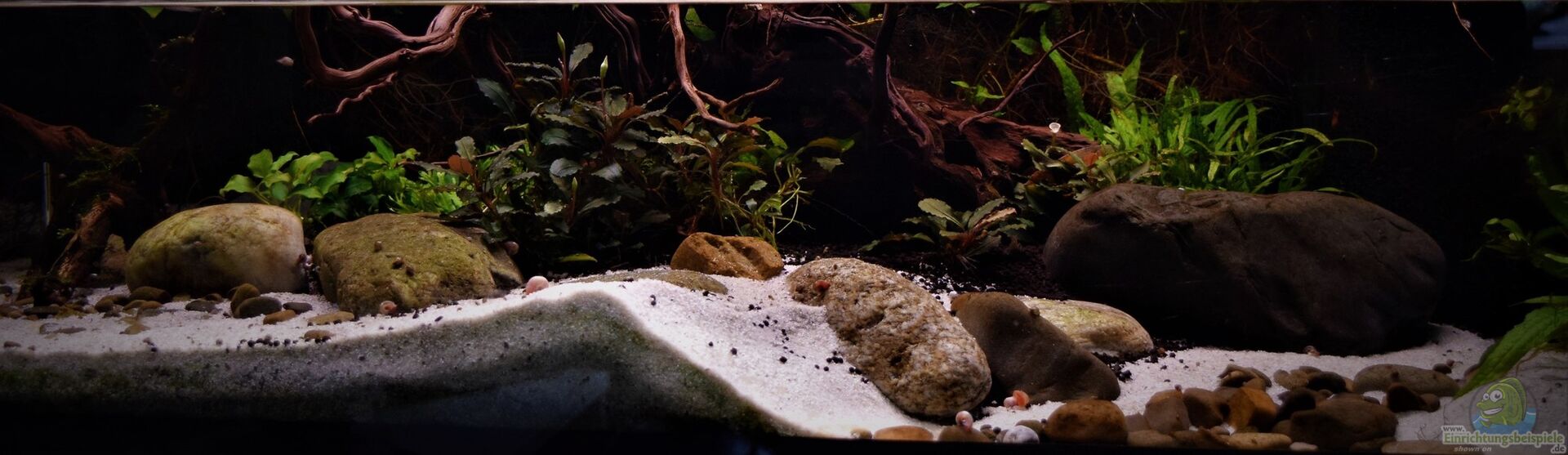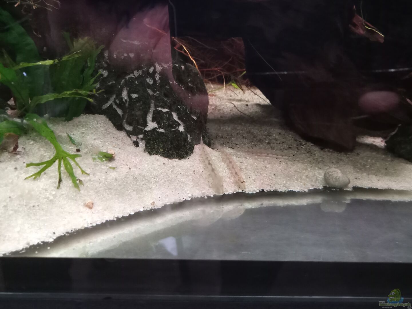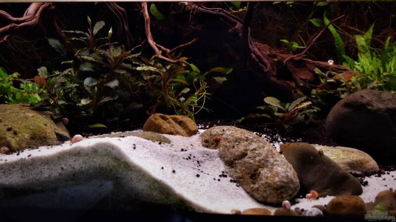 17.12.2020: Der Wasserteil des Beckens wurde heute einer Generalsarnierung unterzogen. Der Sand wurde ausgetauscht, ebenso die kleinen Kiesel. Die grossen Brocken wurden im Becken gelassen, da sich darauf genügend Algen und Aufwuchsnahrung befinden sollte. Die Pflanzenrückwand wurde ebenfalls um ca. ein Drittel eingekürzt und ein Wasserwechsel von 70-80 % vorgenommen.
