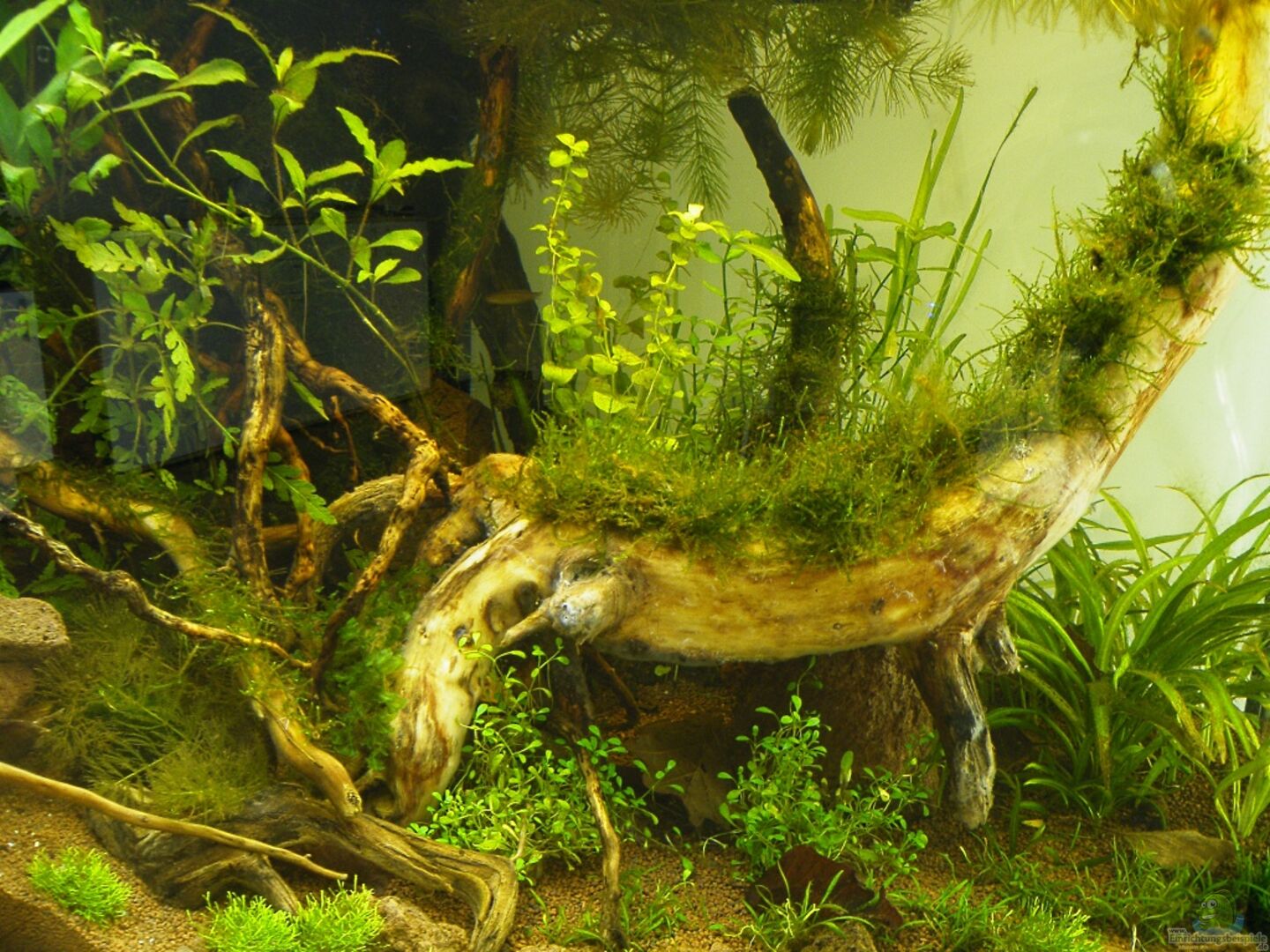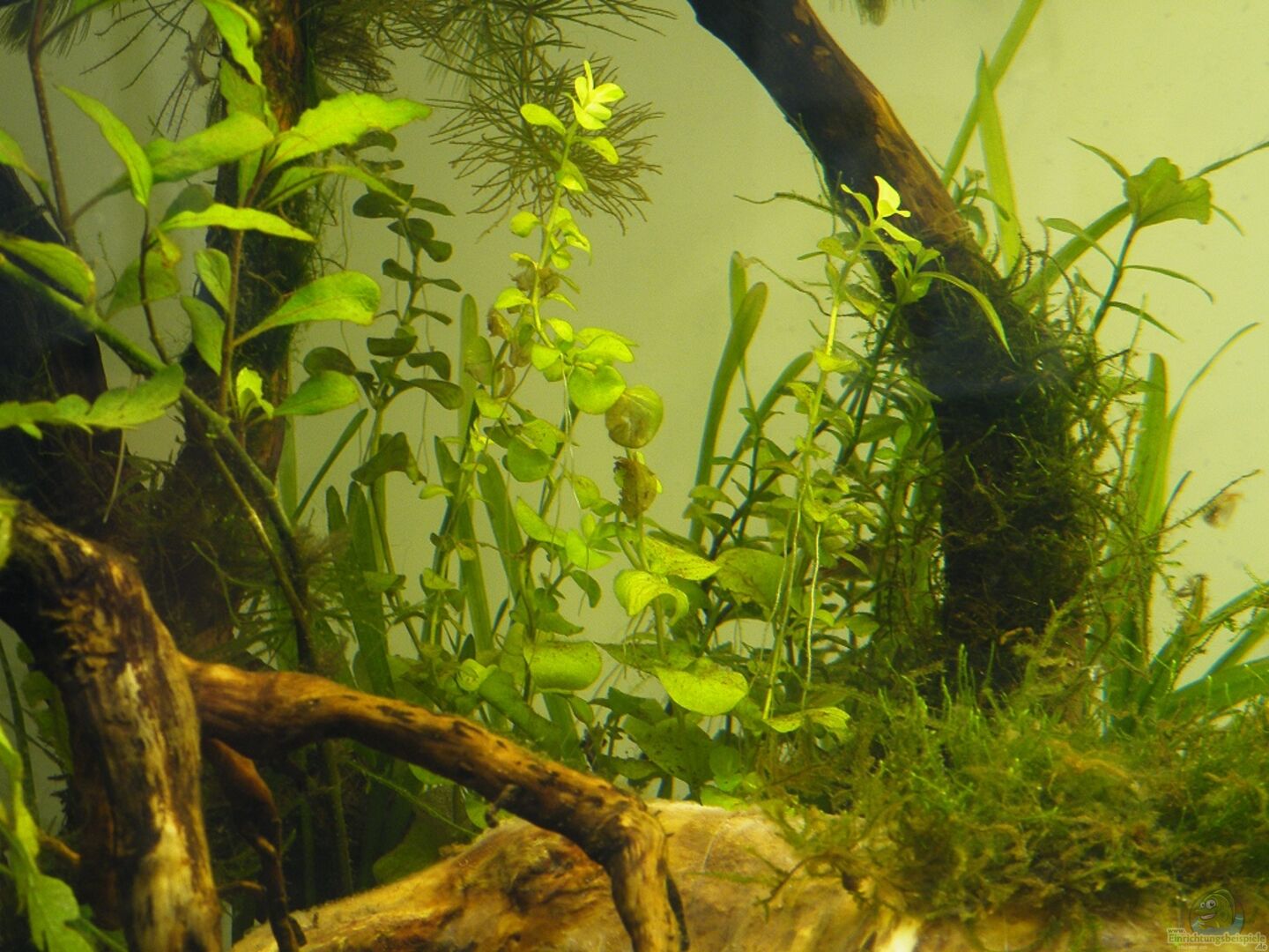 Die Pflanzen entwickeln sich prächtig. Einige Stängel des indischen Wasserfreund haben schon die Wasseroberfläche erreicht bzw. wachsen nun schon emers weiter. Das bedeutet, dass sie ca. 25-30 Zentimeter gewachsen sind. Die Moose haben enorm an Masse zugelegt und die Cryptocoryne und das Blyxkraut sind auch angekommen und bilden neue Blätter aus.