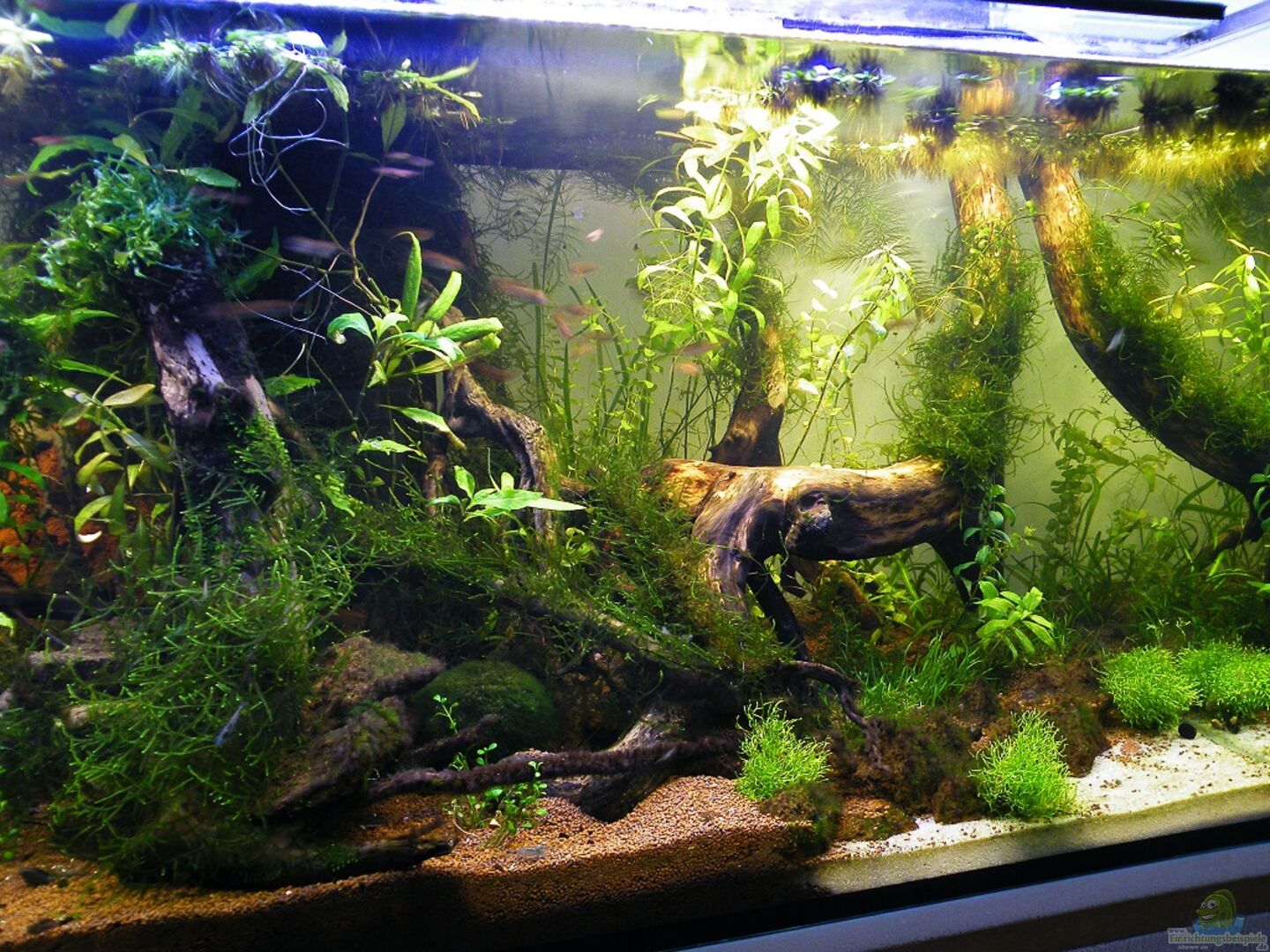 Genau 4 Wochen ist das Becken nun alt. Mittlerweile hat sich das Algenwachstum wieder eingestellt, bis auf wenige Fadenalgen ist kein grö??eres Wachstum mehr zu erkennen. Auch der Bakterienfilm, welcher an der gro??en rechts angeordneten Wurzel war, hat sich nun vollständig aufgelöst. Die Wasseroberfläche ist nun ohne Kahmhautpartikel, das Wasser von Beginn an sehr klar. Ein Blick von oben bis zum Bodengrund offenbart eine tolle Sicht.