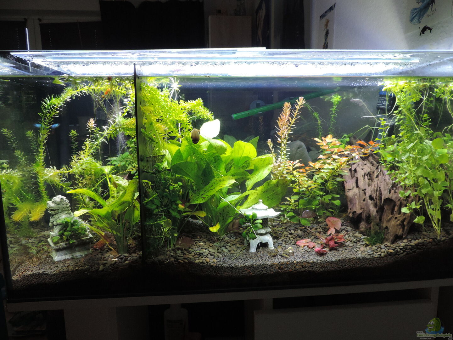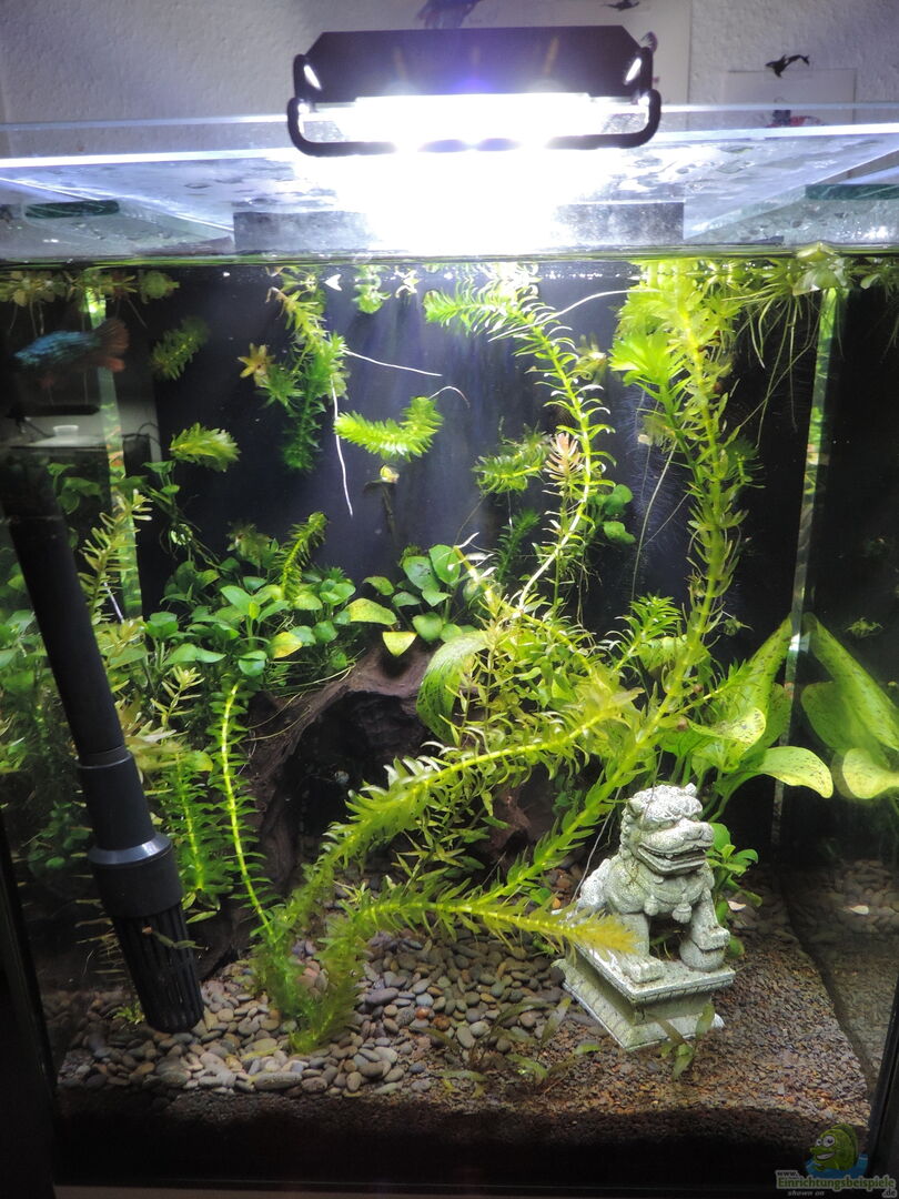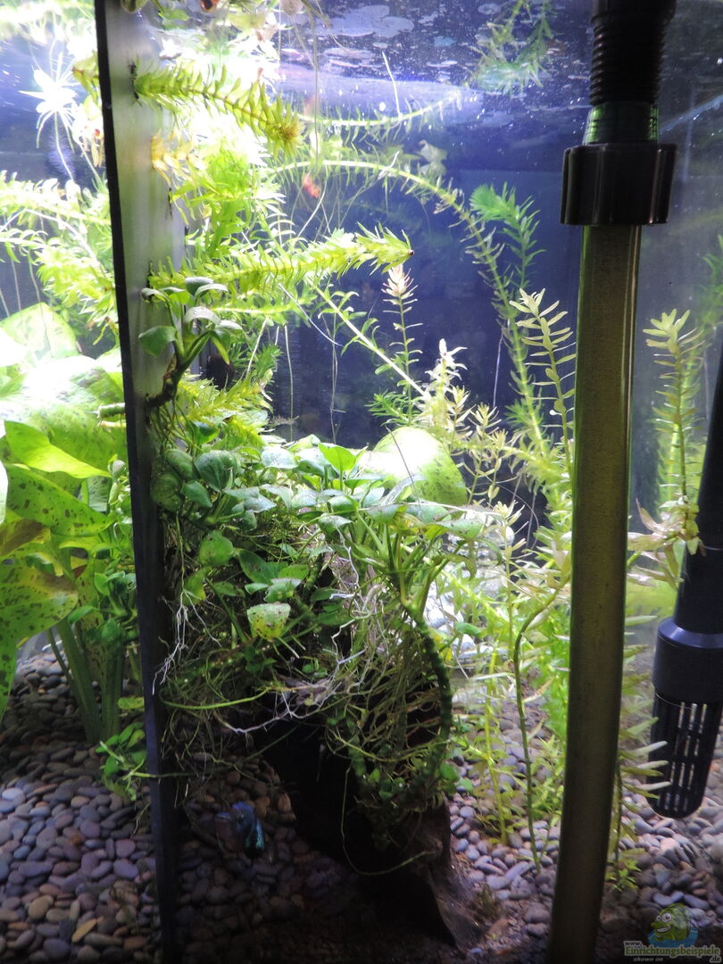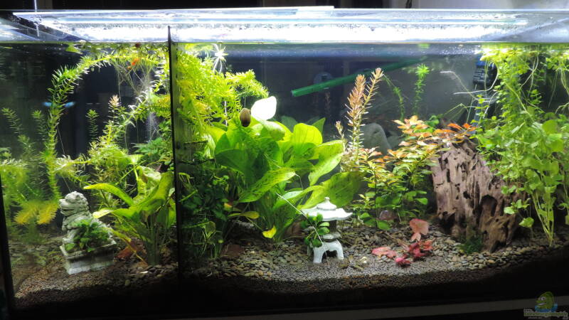 Das Becken ist durch eine blickdichte Hobbyglasscheibe getrennt. Das kleinere Abteil ist für das Kampffischmännchen.
