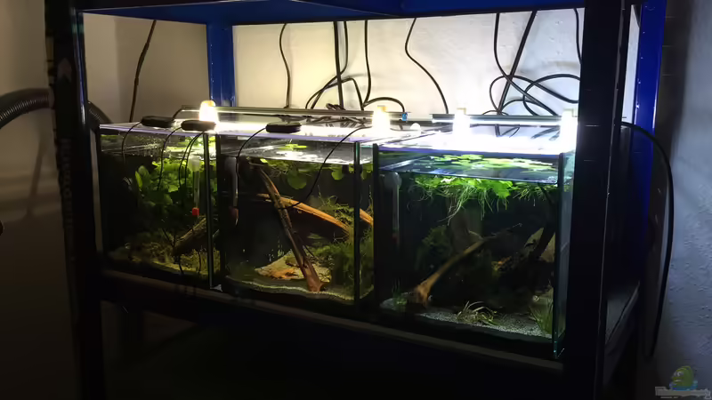 Es handelt sich um 3 einzelne 25 Liter Aquarien. Die Seiten- und Rückscheiben sind mit schwarzer Klebefolie beklebt, damit sich die drei Kampffische nicht sehen können. Die Aquarien sind mit Plexiglasscheiben abgedeckt.
