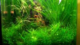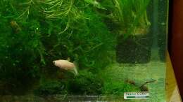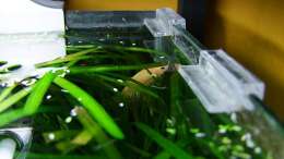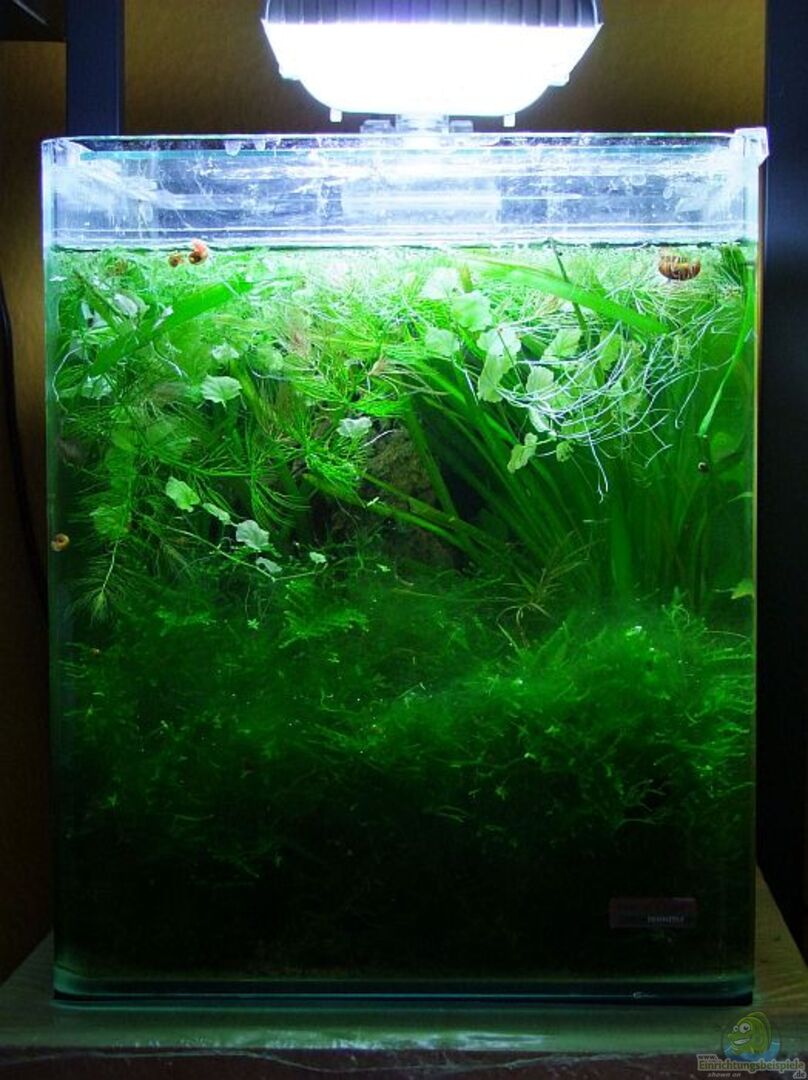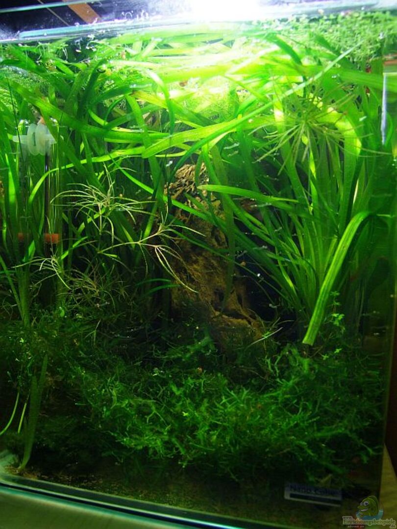 Anfangs hatte ich ziemliche Probleme mit dem Wasser: Es bildeten sich Faulgase, erkennbar am üblen Geruch nach faulen Eiern. Die Sofortma??nahme: häufige und gro??e Wasserwechsel, bei so einem kleinen Becken natürlich zum Glück kein gro??es Ding. Der ganze Spuk dauerte etwa drei Wochen. Der Grund war mit ziemlicher Sicherheit der Sü??wassertang. Dieser zeigte bei mir schon öfters Probleme bei der Umstellung von einem aufs andere Becken. Mit einer Reduzierung des Lichts kommt er wirklich schwer klar und dann gammelt erstmal ein Teil weg- so auch hier: Ich hatte den Tang aus meinem gro??en Becken von einer Stelle knapp unter den Lampen genommen. Hat er sich aber erst mal eingewöhnt, klappts wieder und die Wasserqualität ist in Ordnung; dann wächst er auch willig bei etwas weniger Licht.