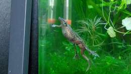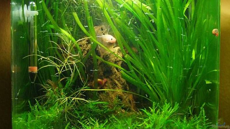 Das Becken ist auf Dauer zu klein für das Trio, aber als Hochzeitsbecken taugt es prima. Die Tiere finden genügend verstecke und werden reichlich mit Lebendfutter versorgt.