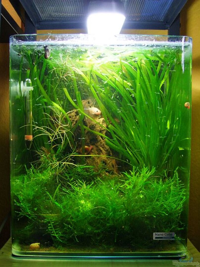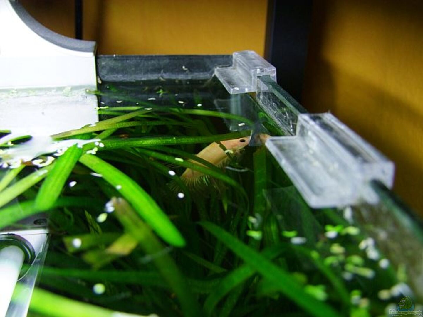 Ursprünglicher Besatz: 1 Betta splendens, HM, männlich, Farbe: Cellophane. Das Kerlchen war bei mir geboren und aufgewachsen. Leider hat er zuletzt Selbstmord begangen. Während dreitägiger Abwesenheit ging die Lampe kaputt; sie flackerte nur noch stroboskopartig. Ob es das war, was den Fisch zu seinem Sprung aus dem Becken veranlasst hat, wei?? ich nicht- es war jedenfalls Pech und tut mir sehr leid. Es befindet sich zwar eine Abdeckscheibe drüber, diese ist aber zu klein und lässt offensichtlich eine genügend gro??e Lücke :-(
