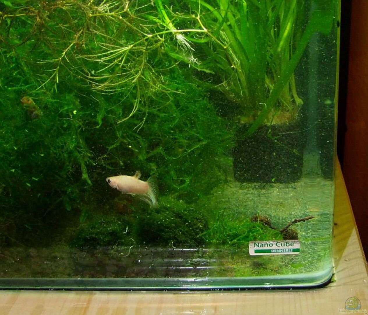 Au??erdem im Becken: "Eine Hand voll" Neocaridina heteropoda, Posthornschnecken braun und rot und ein altes Dario dario-Männchen, das dort sein Gnadenbrot bekommt und vom vielen Lebendfutter profitiert.
