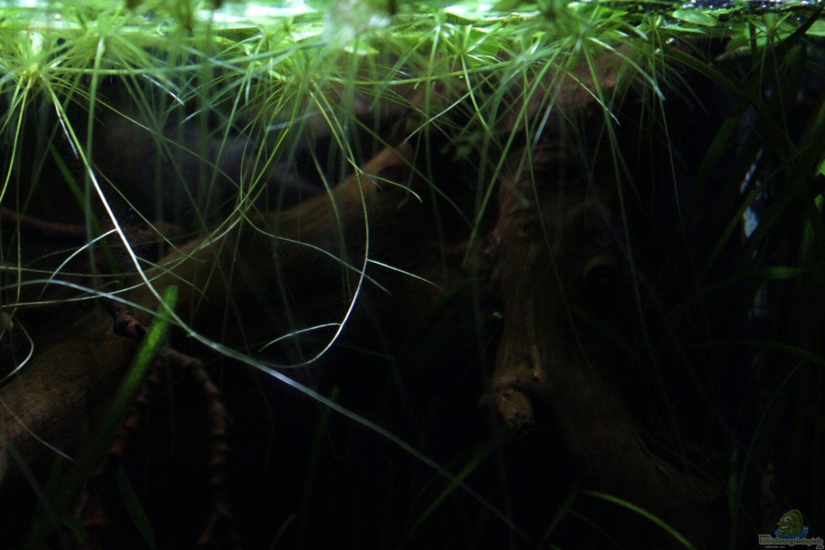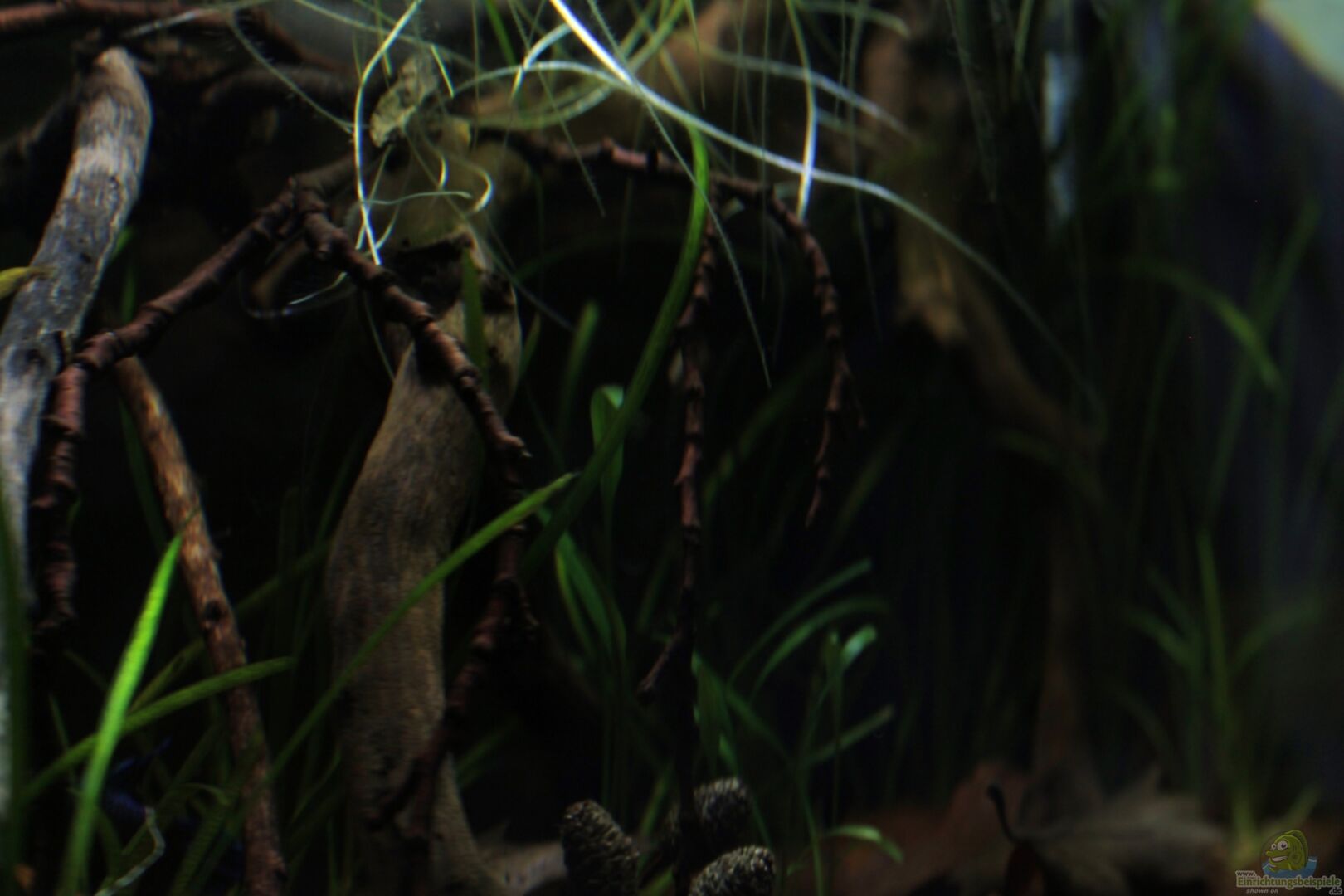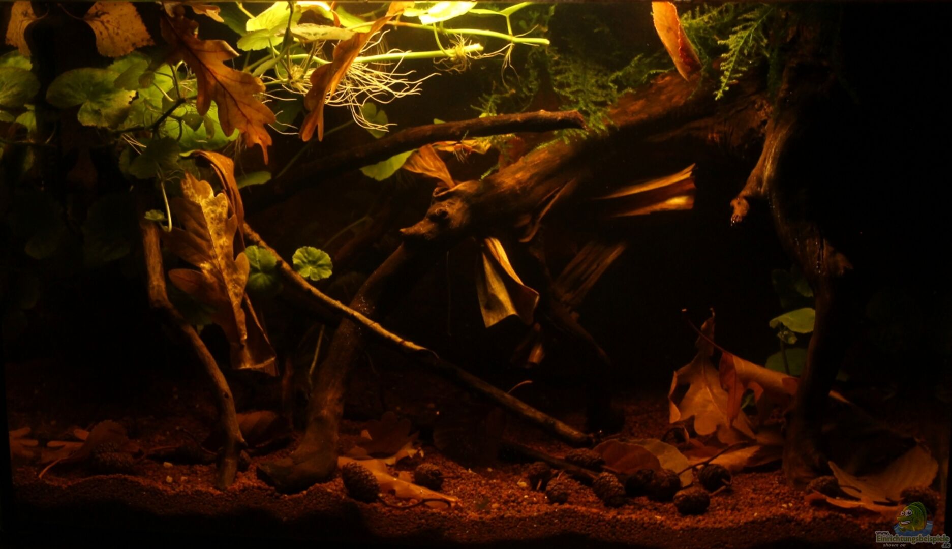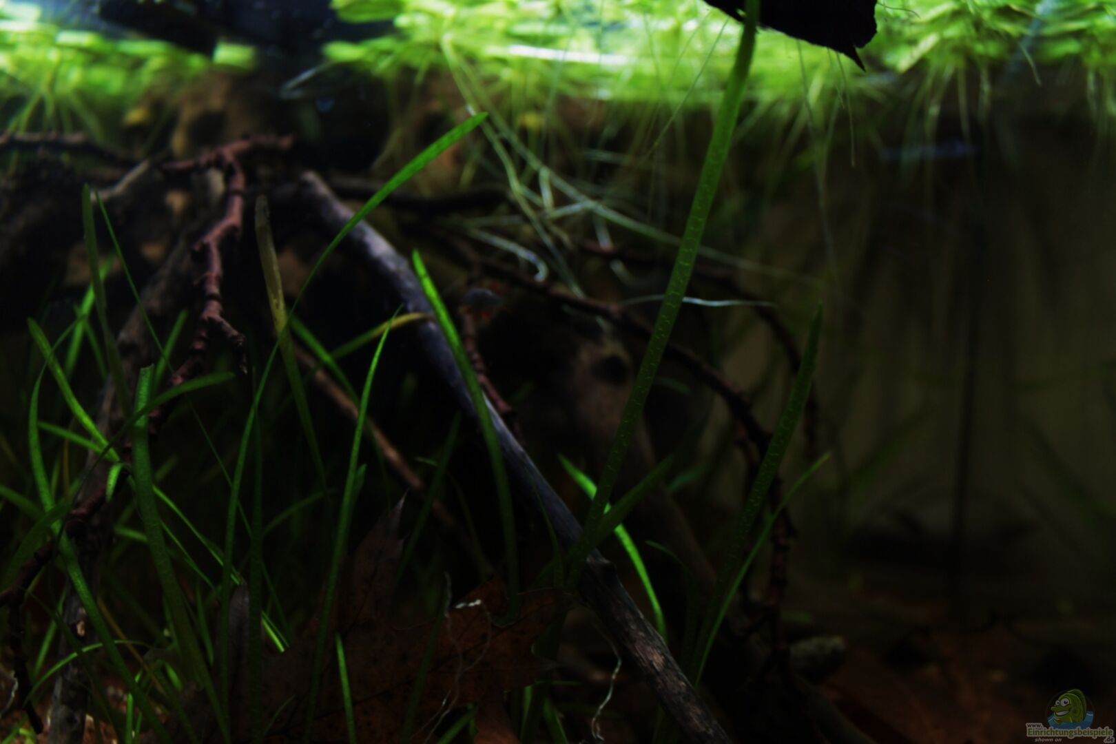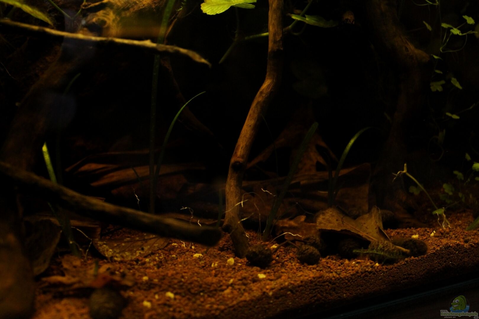 Die Garnelen beeindruckt das recht wenig, zeigen sich auch sehr oft im vorderen Bereich. Es befindet sich aber auch immer recht viel Laub am Boden, dieses sorgt für sehr viele Verstecke, Nahrungsergänzung, natürliche Optik und gibt ein wenig Huminstoffe mit ins Wasser. Die Huminstoffe säuern das Wasser ein wenig an und beugen u.a. Verpilzungen bei.