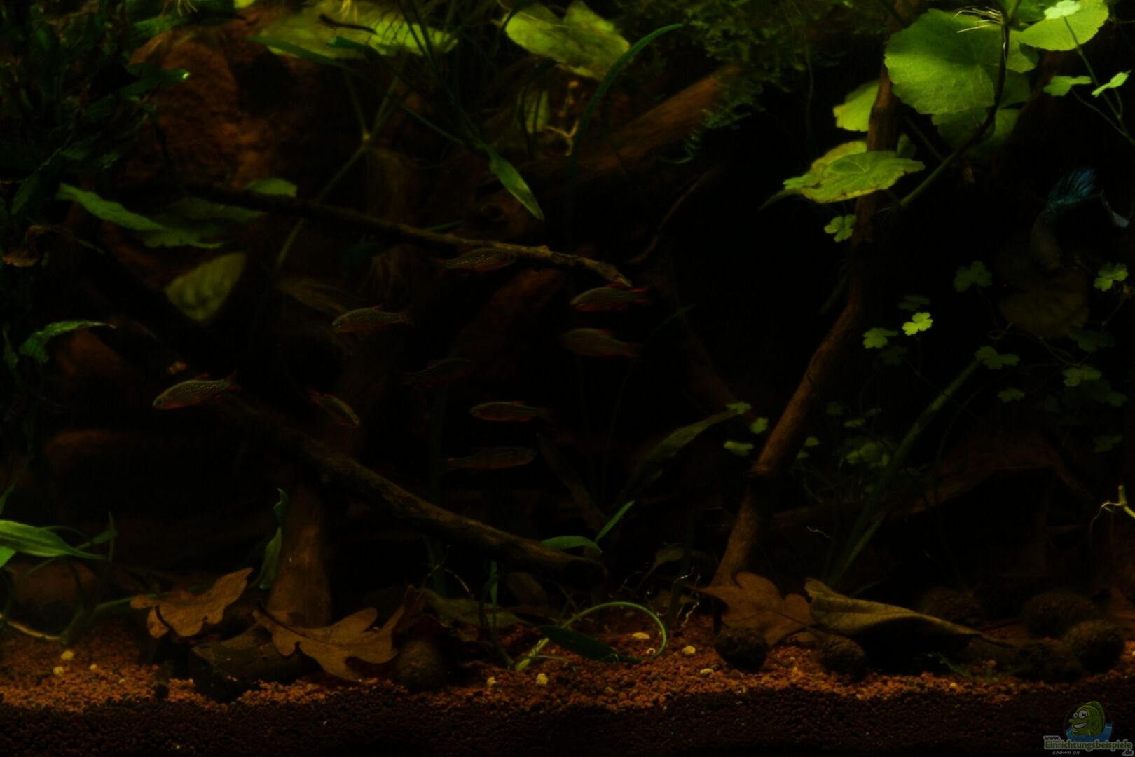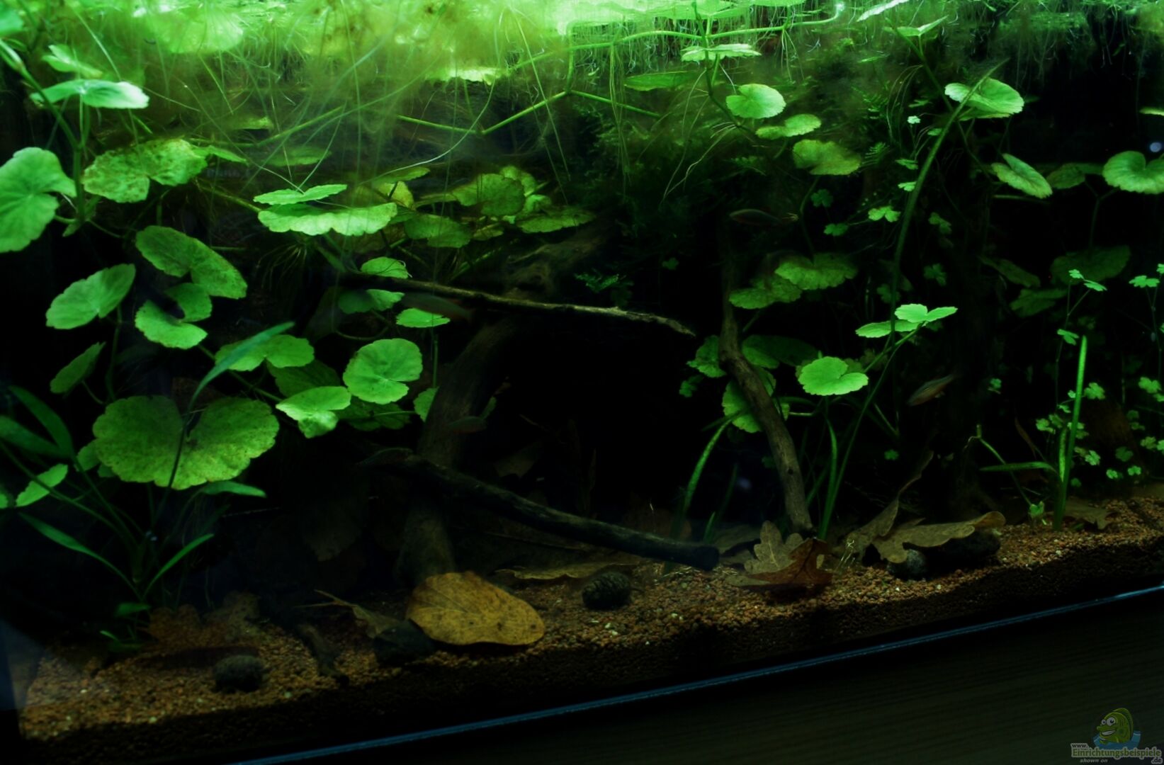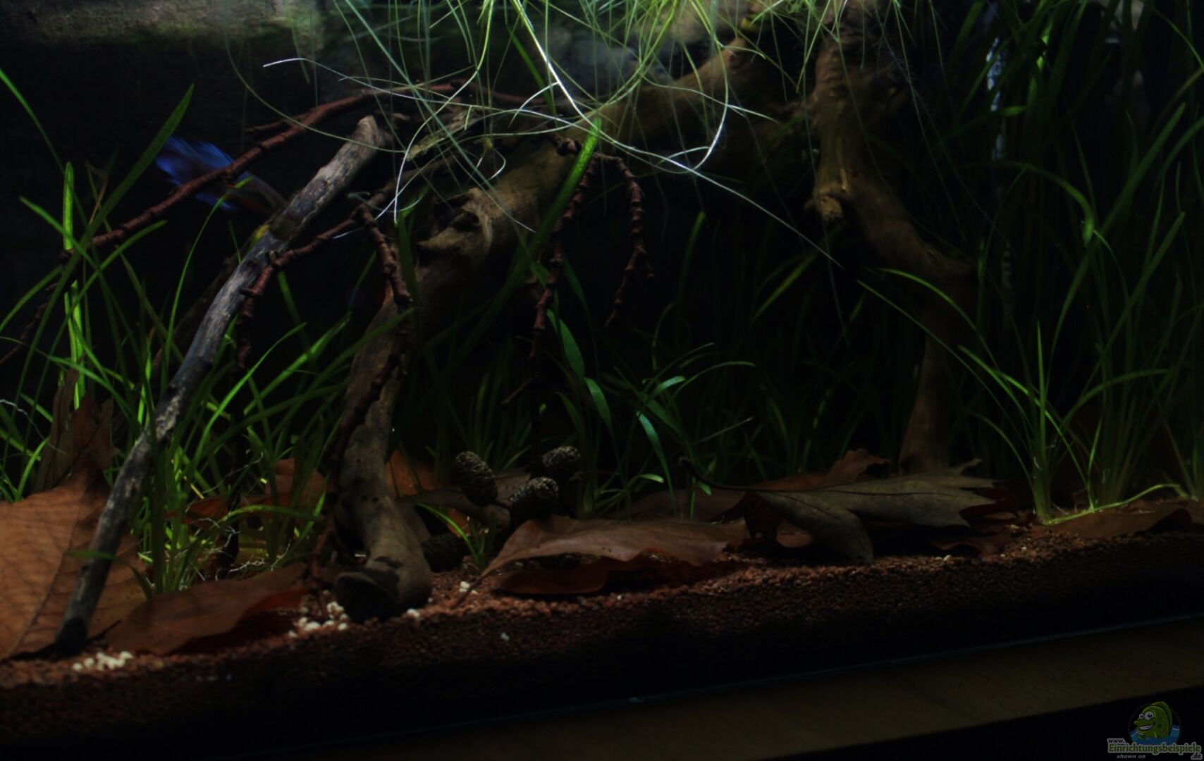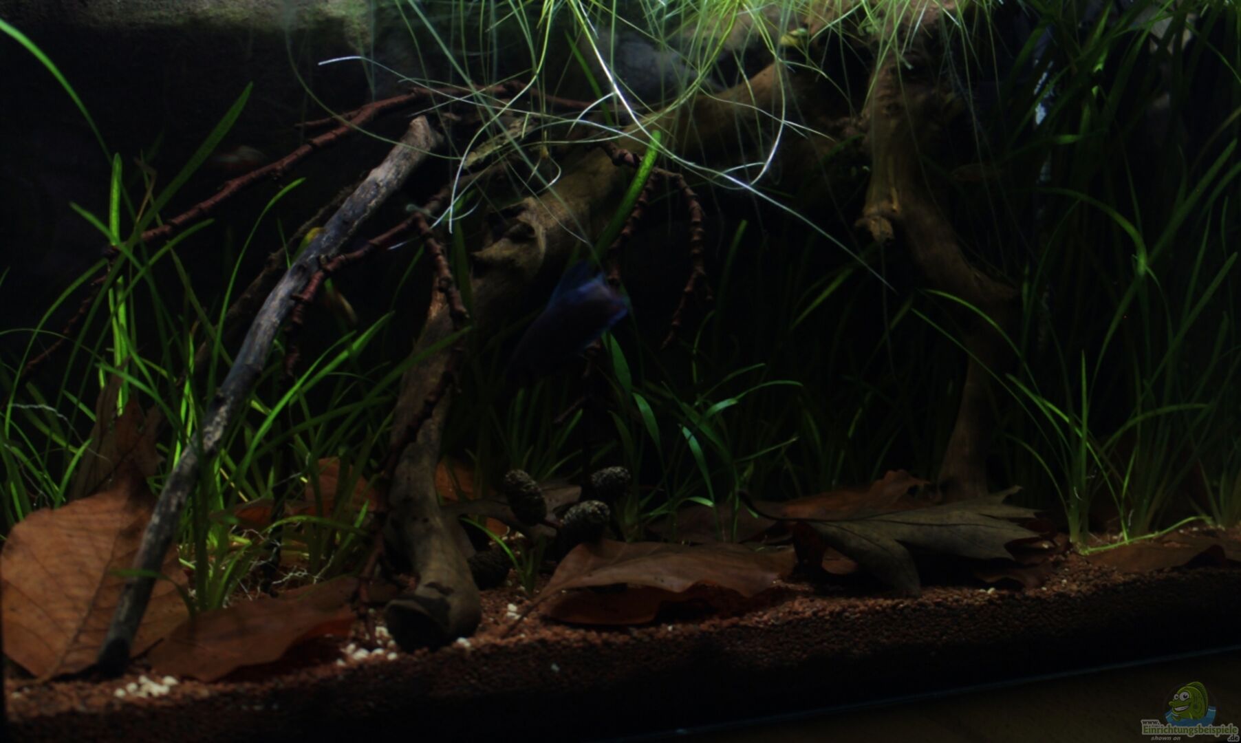 Die Garnelen beeindruckt das recht wenig, zeigen sich auch sehr oft im vorderen Bereich. Es befindet sich aber auch immer recht viel Laub am Boden, dieses sorgt für sehr viele Verstecke, Nahrungsergänzung, natürliche Optik und gibt ein wenig Huminstoffe mit ins Wasser. Die Huminstoffe säuern das Wasser ein wenig an und beugen u.a. Verpilzungen bei.