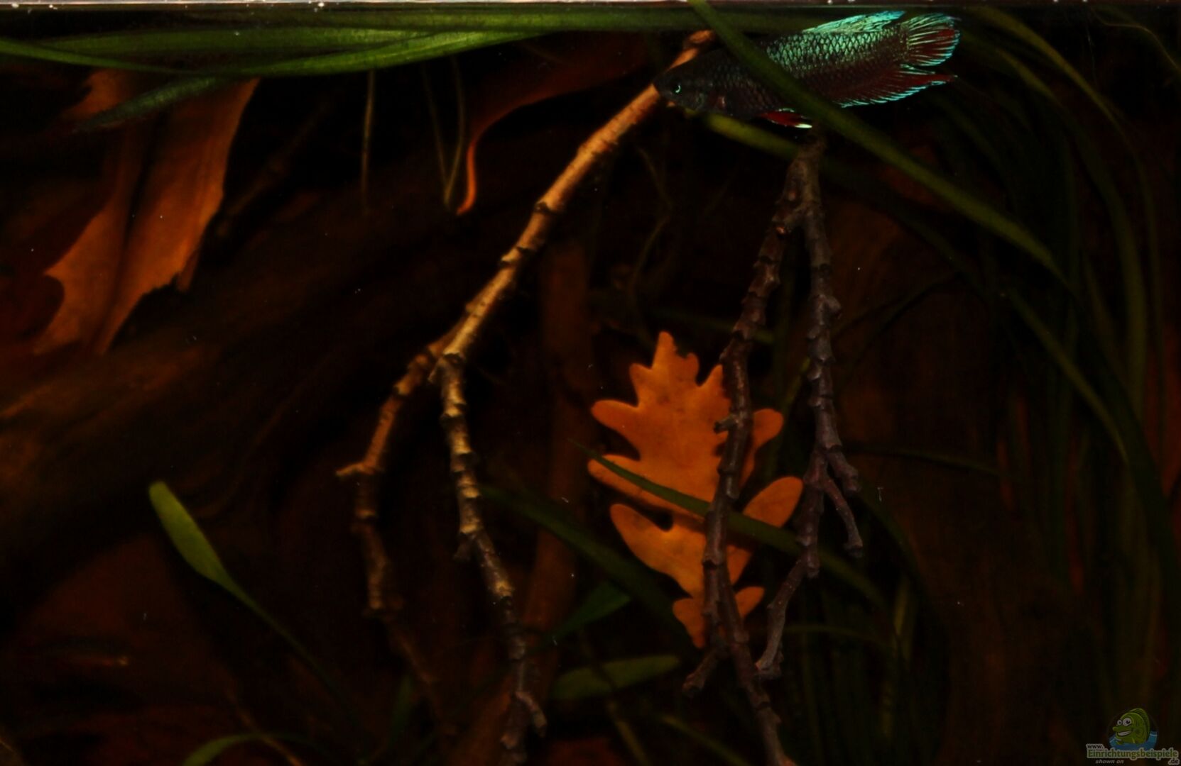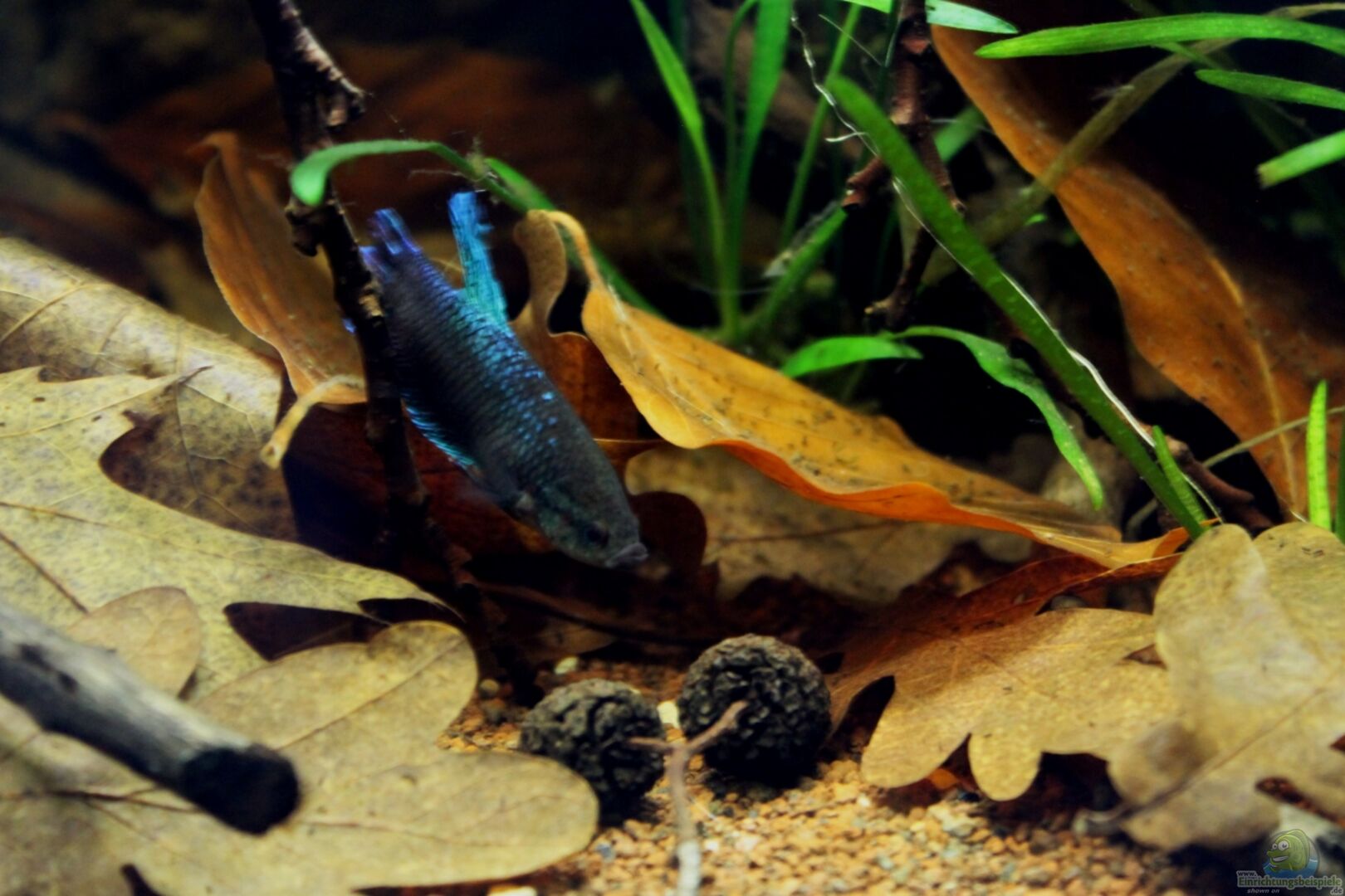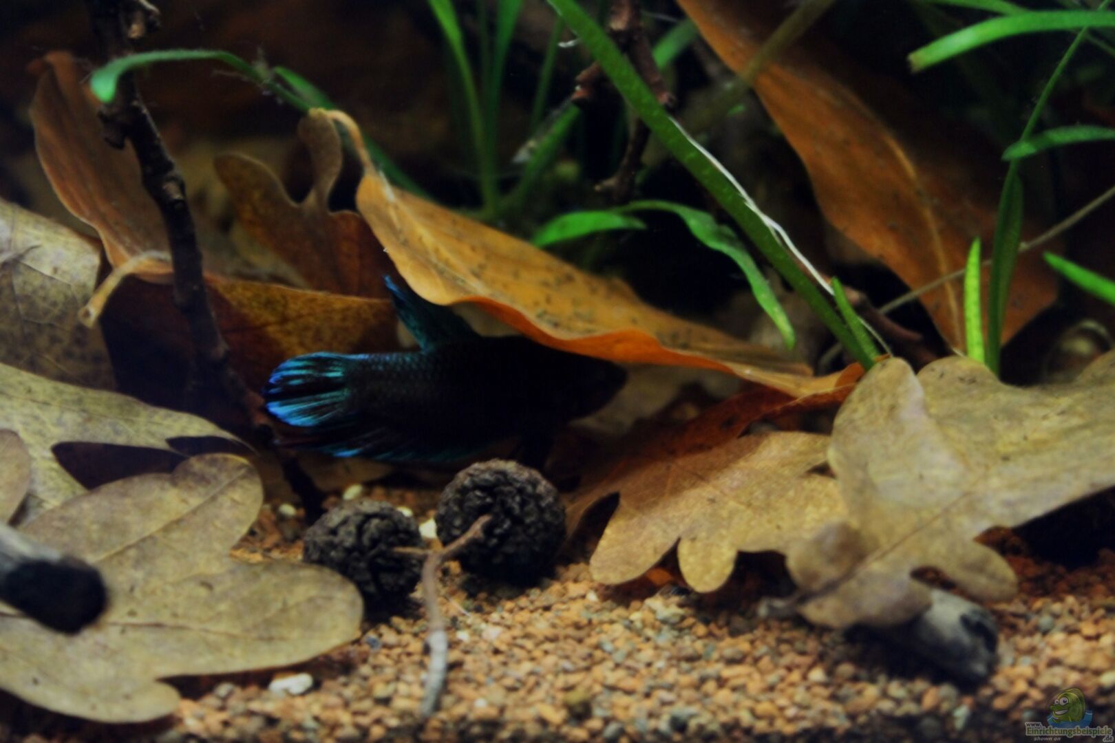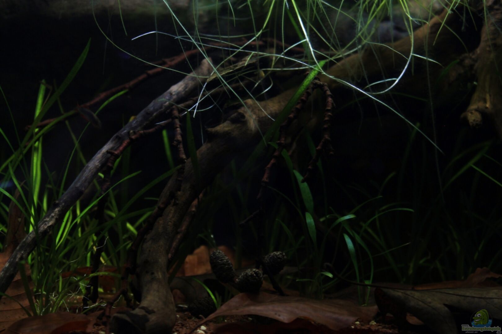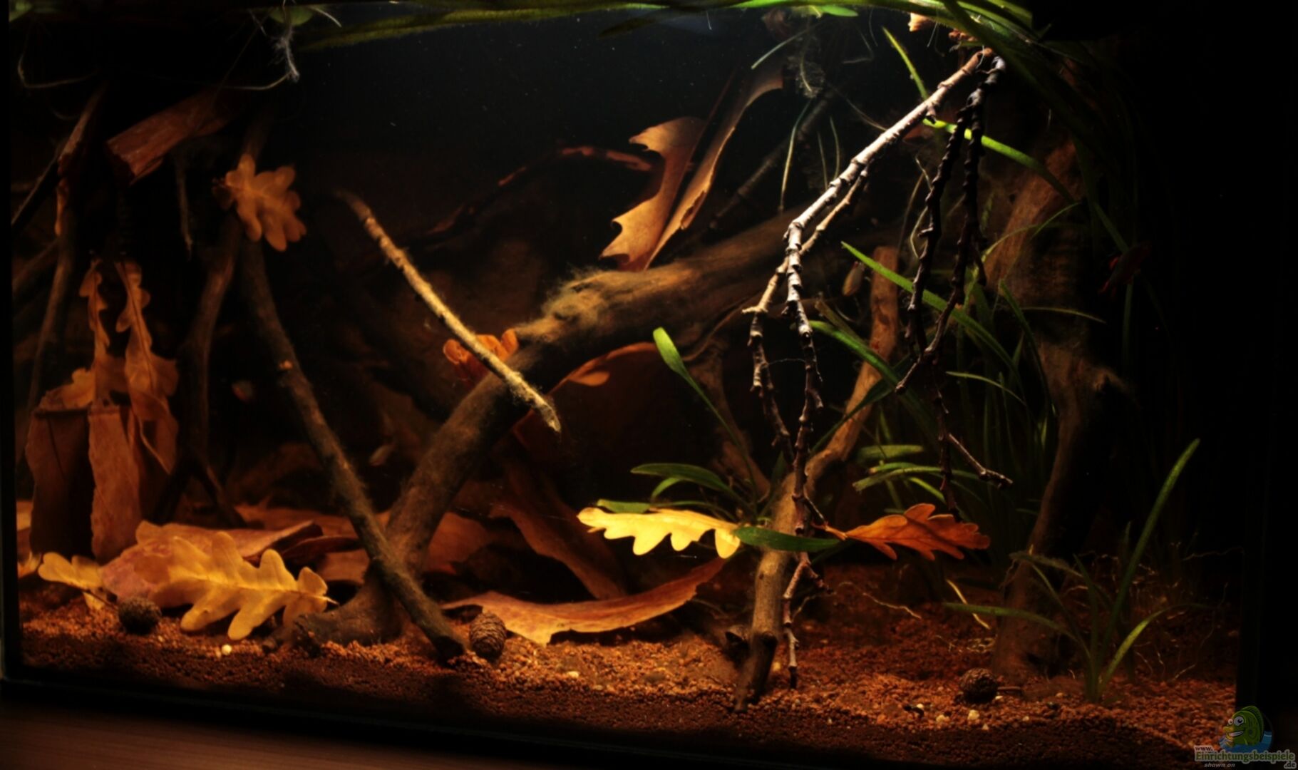 Die Garnelen beeindruckt das recht wenig, zeigen sich auch sehr oft im vorderen Bereich. Es befindet sich aber auch immer recht viel Laub am Boden, dieses sorgt für sehr viele Verstecke, Nahrungsergänzung, natürliche Optik und gibt ein wenig Huminstoffe mit ins Wasser. Die Huminstoffe säuern das Wasser ein wenig an und beugen u.a. Verpilzungen bei.
