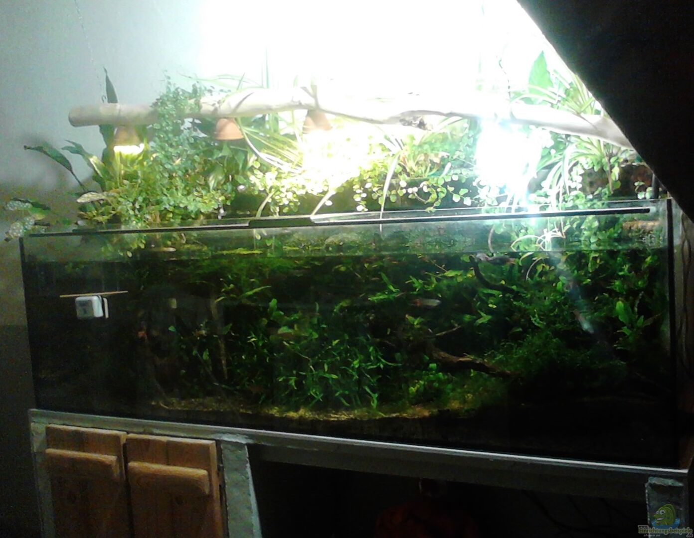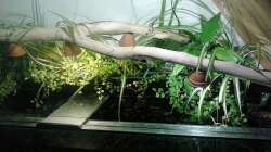 Als weiter Einrichtung ist eine selbstgebaute 3D-Rückwand und reichlich Wurzelholz im Becken.