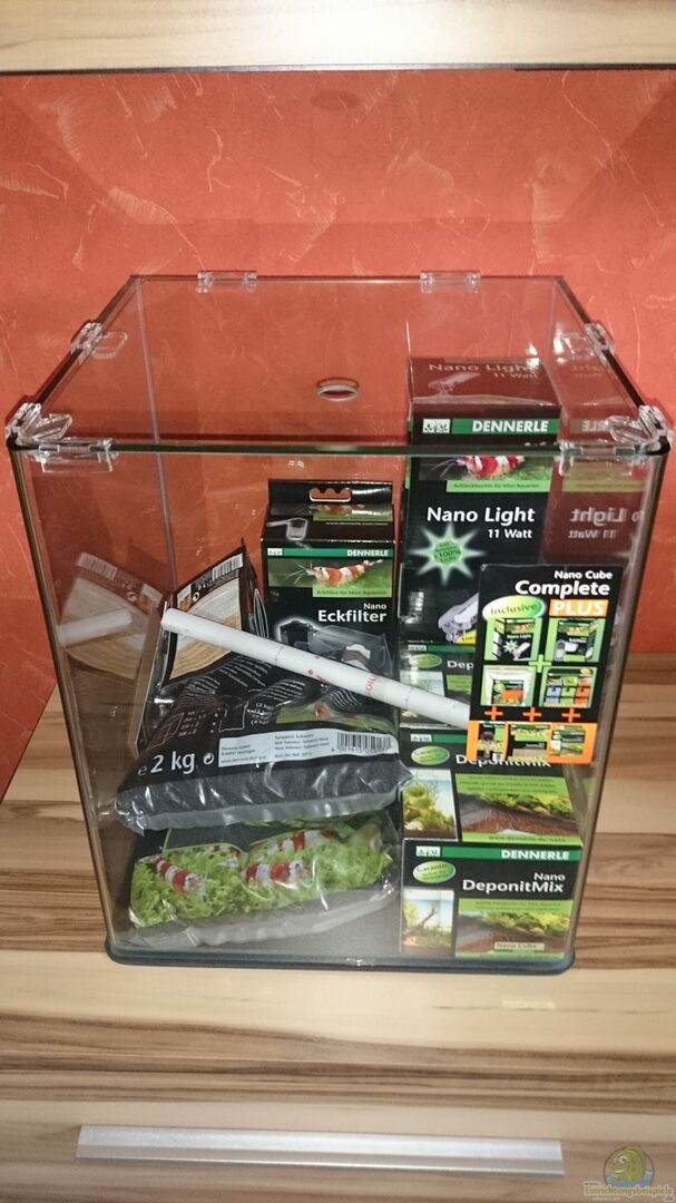 Lieferumfang: Aquarium, Abdeckscheibe, schwarze Rückwandfolie, Schaumstoffunterlage, Nano Eckfilter, Nano Beleuchtung, Tagesdünger, Wasseraufbereiter, Vitalstoffe für Garnelen, Crusta Gran Garnelenfutter, Nano Garnelenkies Sulawesi Black, Nano DepotMix Nährboden, Nano Thermometer