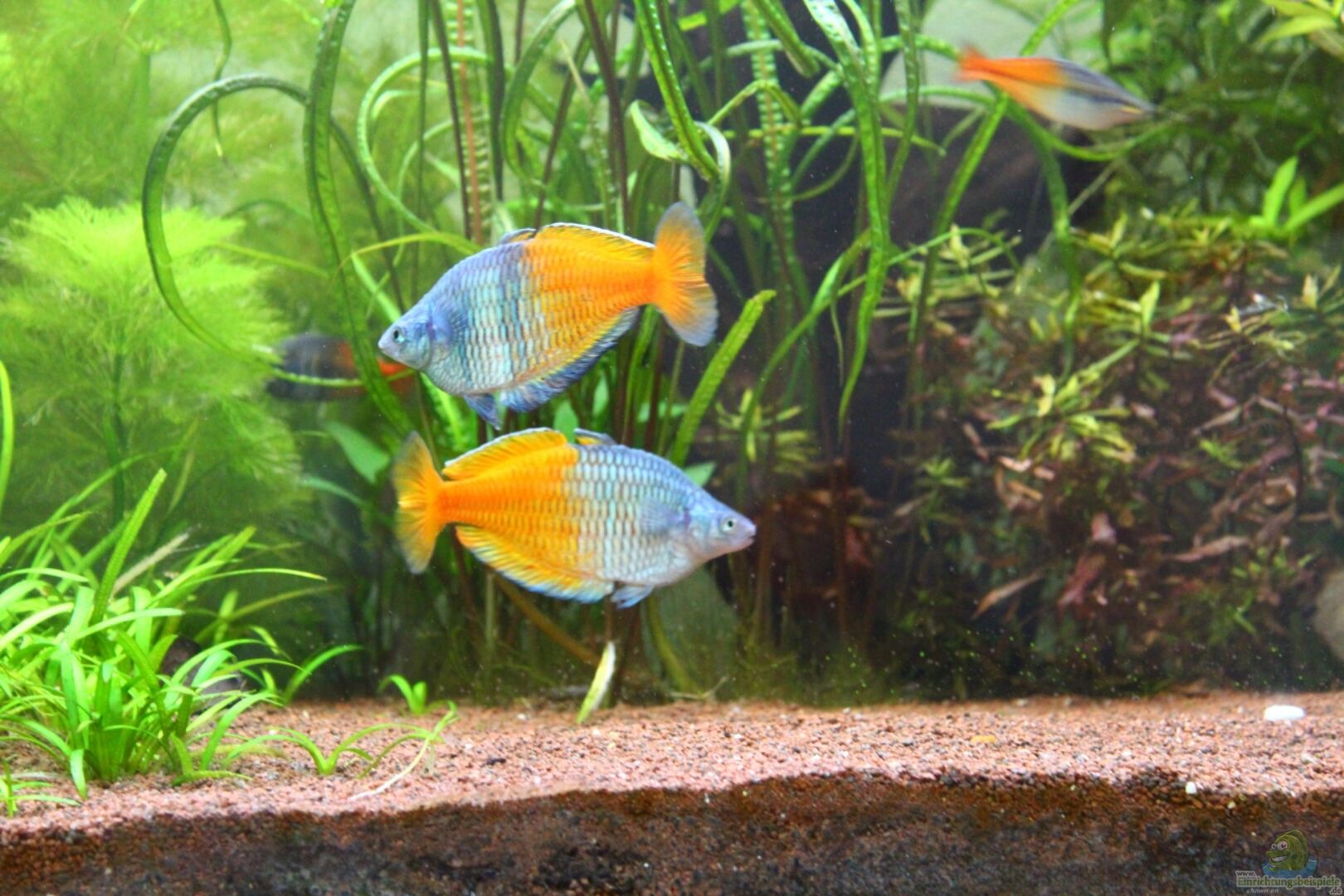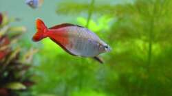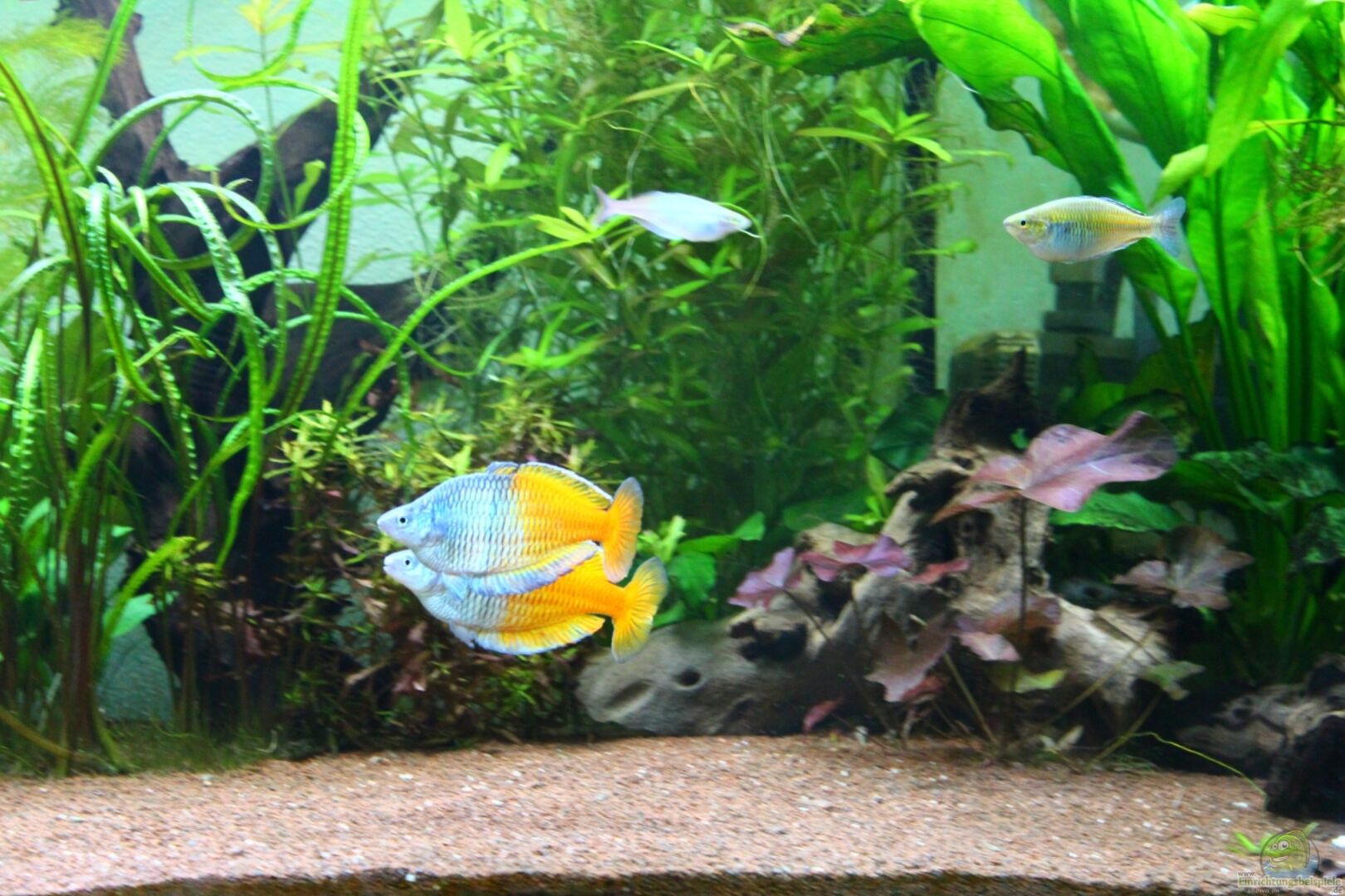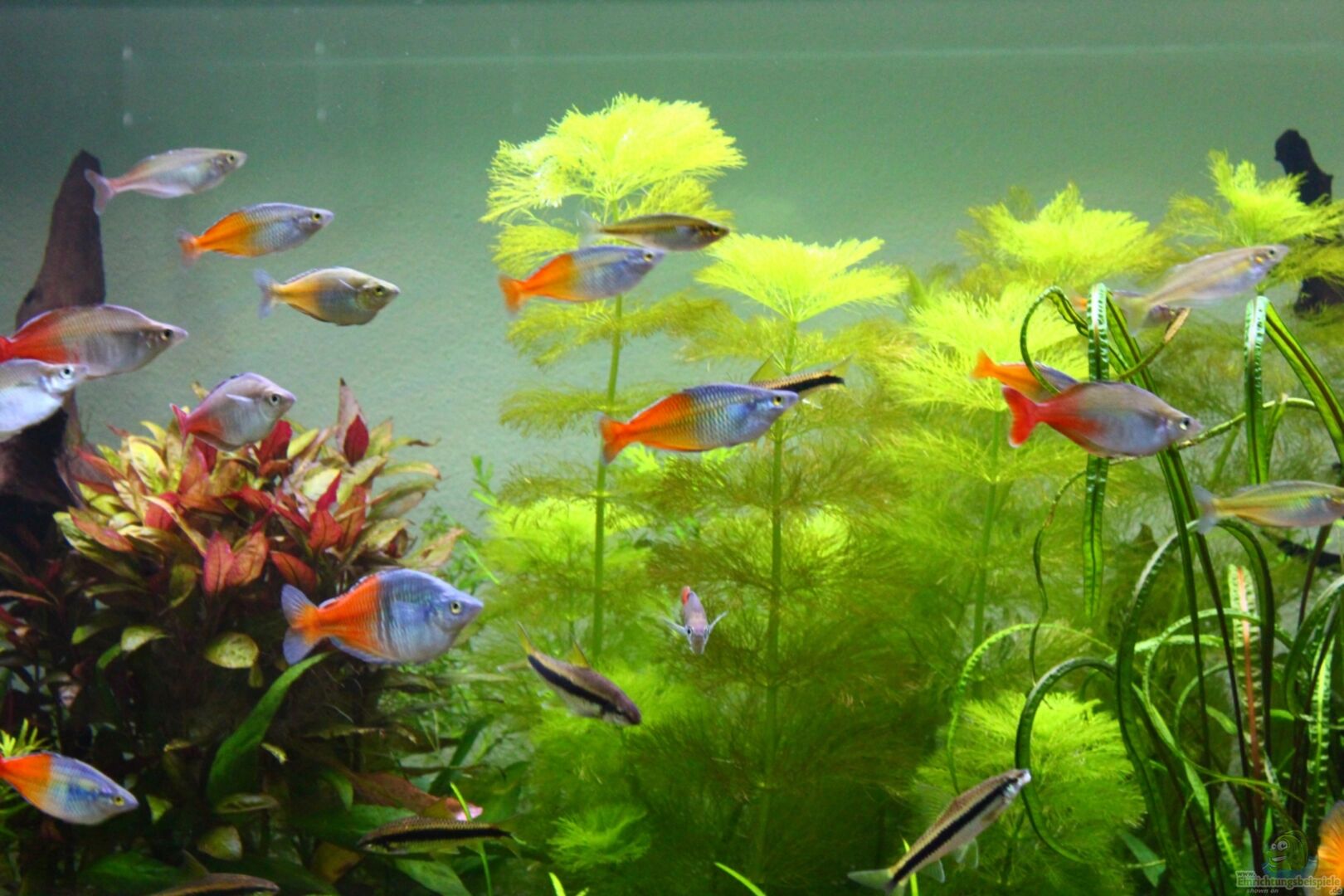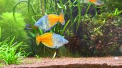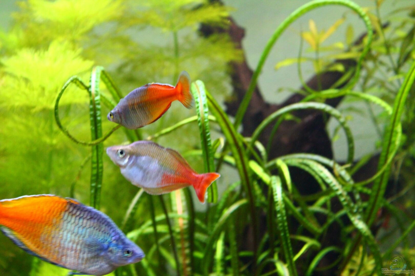 Es hat Speziel für Regenbogenfische erhöhte Brücken, Zwischen Wasserstand und Brücken sind ca. 5 cm Luft damit sich die Fische beim "Futter aufnehmen" nicht den Rücken aufrei??en.