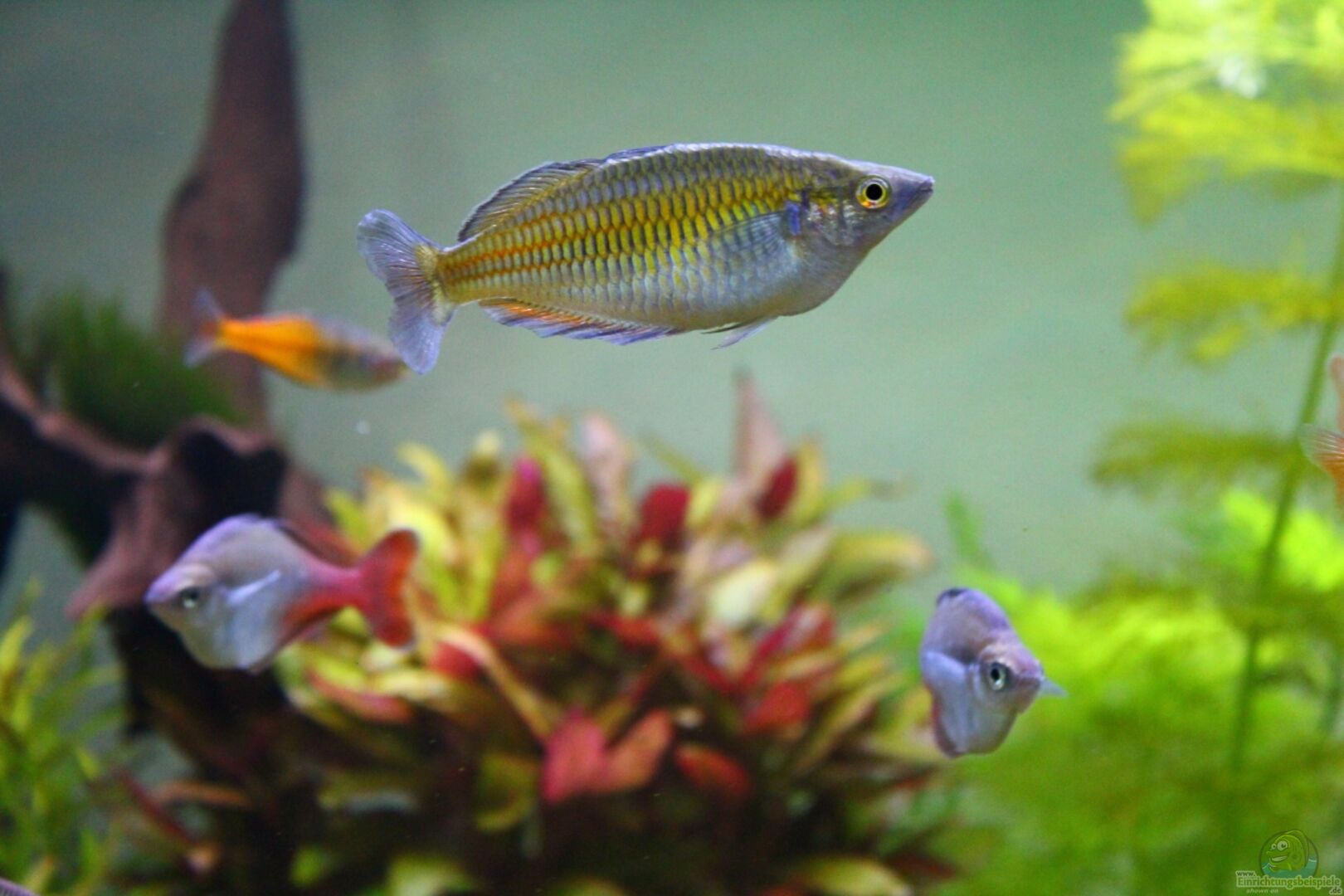 Anubias nana und baterie (rechts hinter der Wurzel und vor den Bleherie´s)