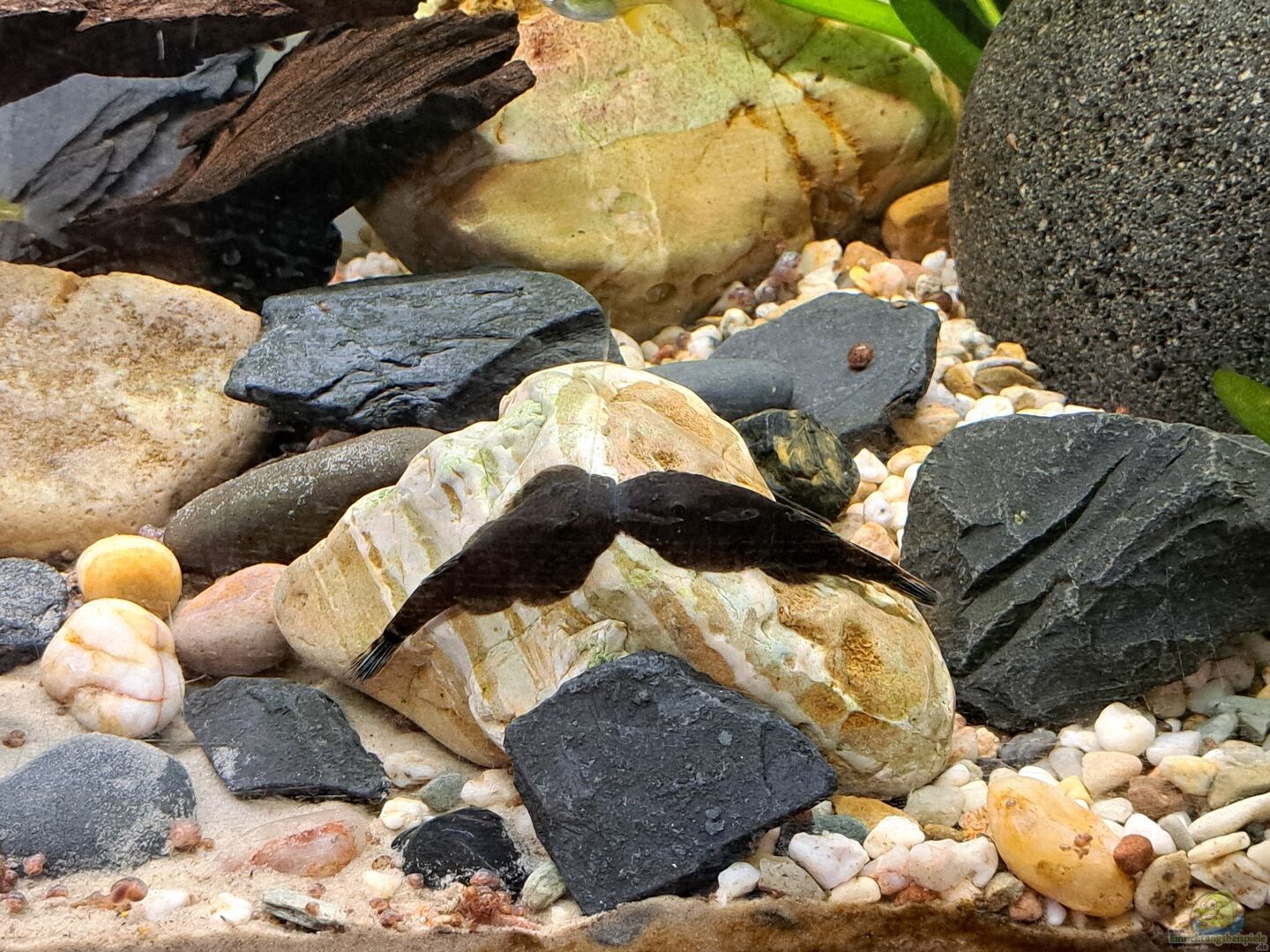 16.06.2025 Inzwischen suchen die Gastromyzon auch gezielt nach den Futtertabletten. So schwierig die Eingewöhnungsphase war, so unkompliziert sind sie inzwischen. Sie lassen sich von mir überhaupt nicht mehr stören, selbst wenn ich direkt vor dem Aquarium sitze.Sie balzen oder streiten sich um einen Stein, aber alles total harmlos.Sogar beim Wasserwechsel schwimmen sie nicht weg.