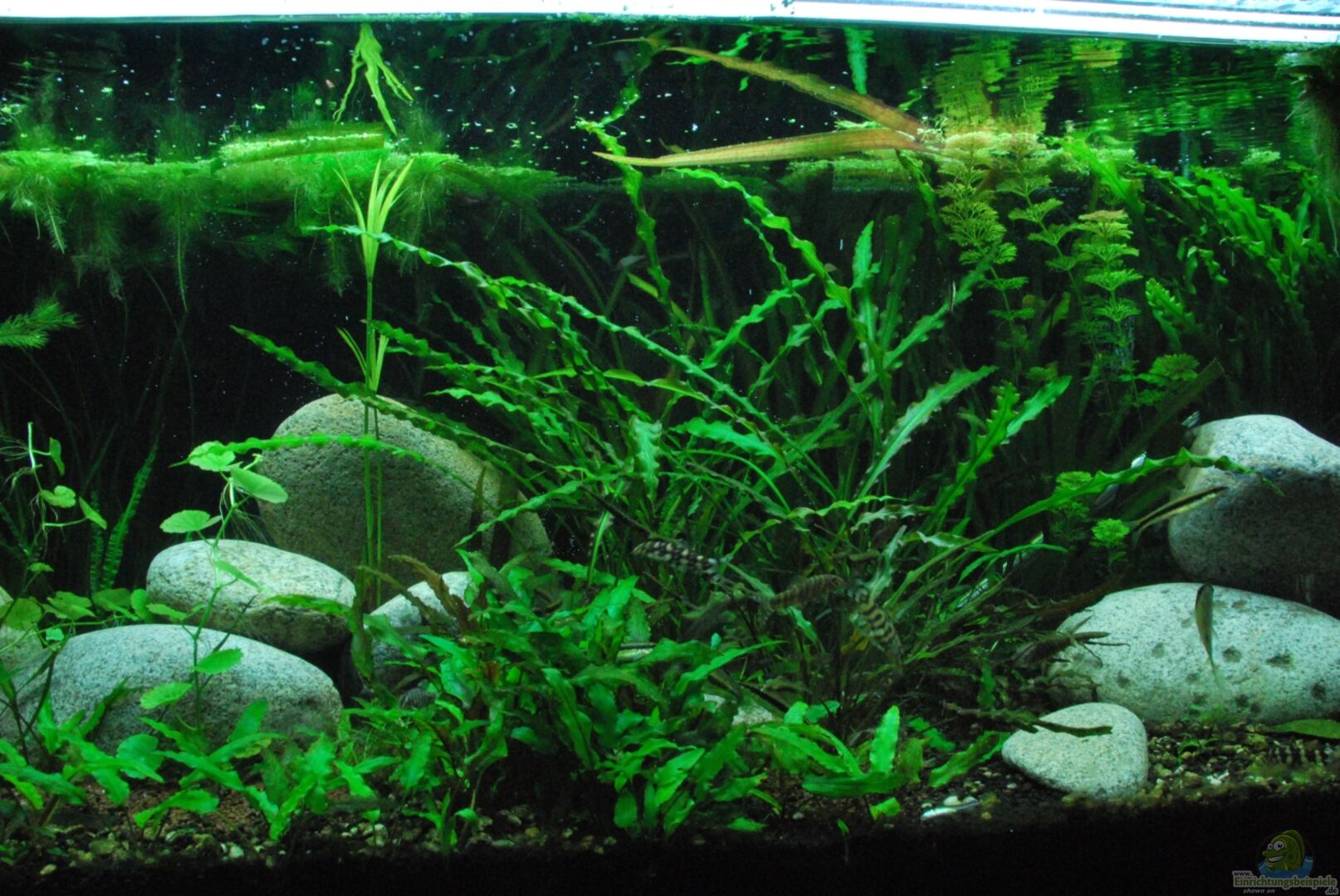 Atès que el problema estava probablement en una saturació de les argiles per trihalometans, cada adobat que feia em desequilibrava tot l'aquari, malgrat utilitzar anàlisis químics de l'aigua i calculadores d'abonat. Vaig decidir la substitució de les argiles per sorra. En el disseny del plantat pràcticament he aprofitat els millors plançons vegetals que hi havia a l'aquari, mantenint al màxim la diversitat, però fent un fort buidat de la fitomassa a la part central per deixar espai lliure per la natació dels peixos. Les plantes sobrants han estat traslladades a cultiu emergit. Els sòlids s'ha distribuit de manera que deixen passadissos entre ells, que són dels gust de les boties. (Pendent de traducció)