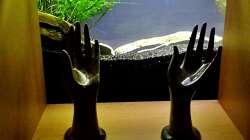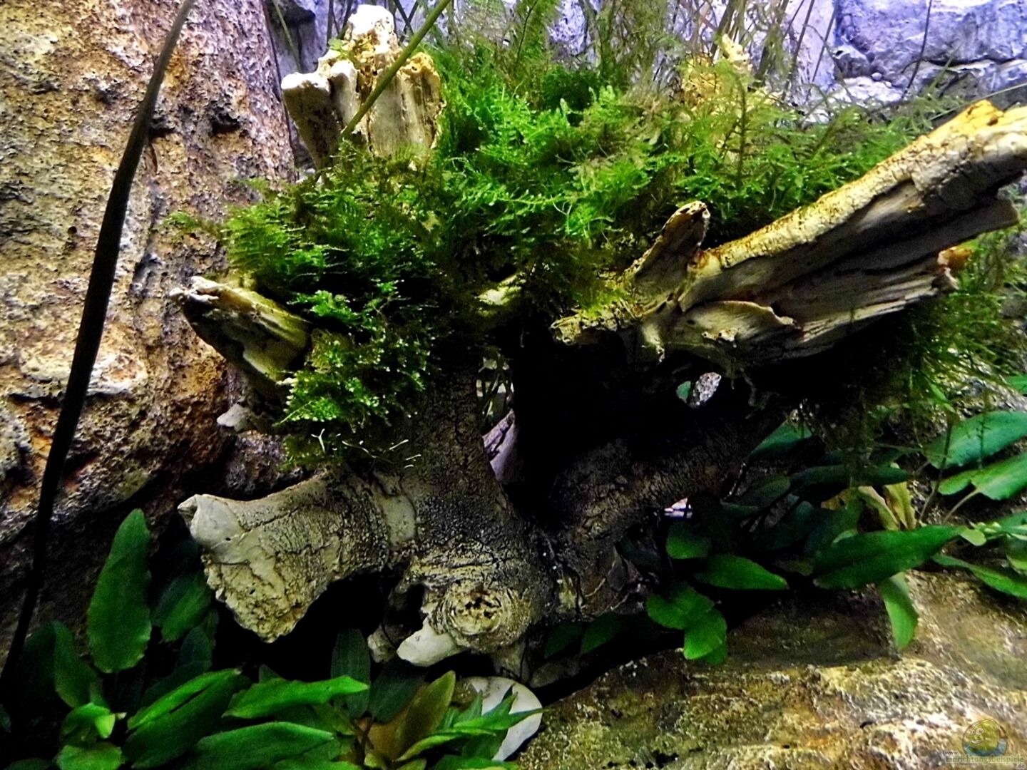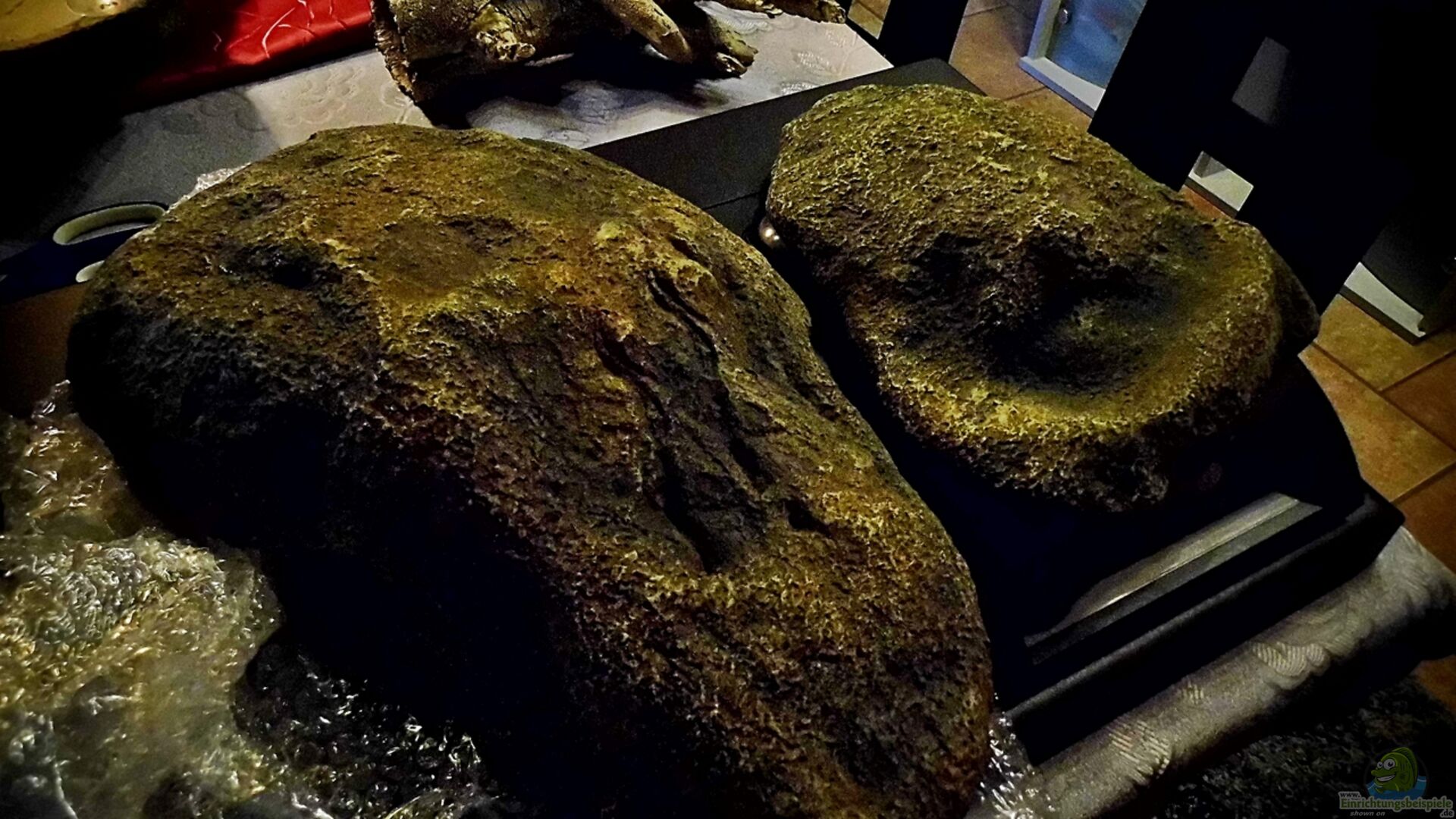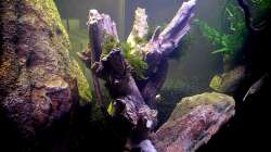 Da ich mit dem Ergebnis nicht so richtig zu frieden war , kam nun eine Rückwand mit Steindekor ins Becken. Die Rückwand ist nur im Sand verankert , nicht geklebt.Durch eine Schrägstellung und durch die vorhandene 3d Struktur ist eine Strömung hinter der Rückwand gegeben. Auch ist ein hinterschwimmen, über die ganze Länge, für die Fische gewährleistet. Obwohl die Rückwand etwas von der Grundfläche wegnimmt , ist eine grö??ere optische Tiefe gegeben.