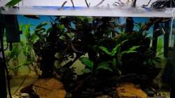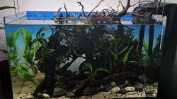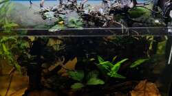 Die Filterung des Aquariums erfolgt mit einem Lufthebefilter. Dieses Aquarium und zwei weitere sind an einem Kompressor angeschlossen (Leistungsaufnahme 5W). Dies ist eine Energiesparende und einfache Möglichkeit das Aquarium ausreichend zu Filtern.