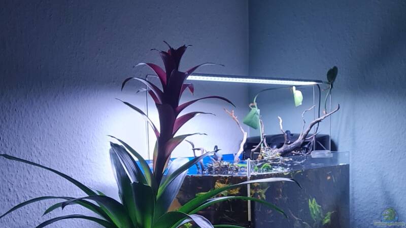 Zur Beleuchtung wird eine Chihiros Serie A A601mit einem LED System Edelstahlständer genutzt. Das LED System hat 39 W. Diese besitzt ca. 8000K und ca. 5800Lumen. Die Beleuchtungsstärke habe ich auf die minimalste Helligkeit gestellt und der Abstand zur Gewässeroberkante ist mit den Edelstahlbügeln auf den max. Abstand zur Wasseroberfläche eingestellt. Somit ist die Beleuchtung nicht zu stark.
