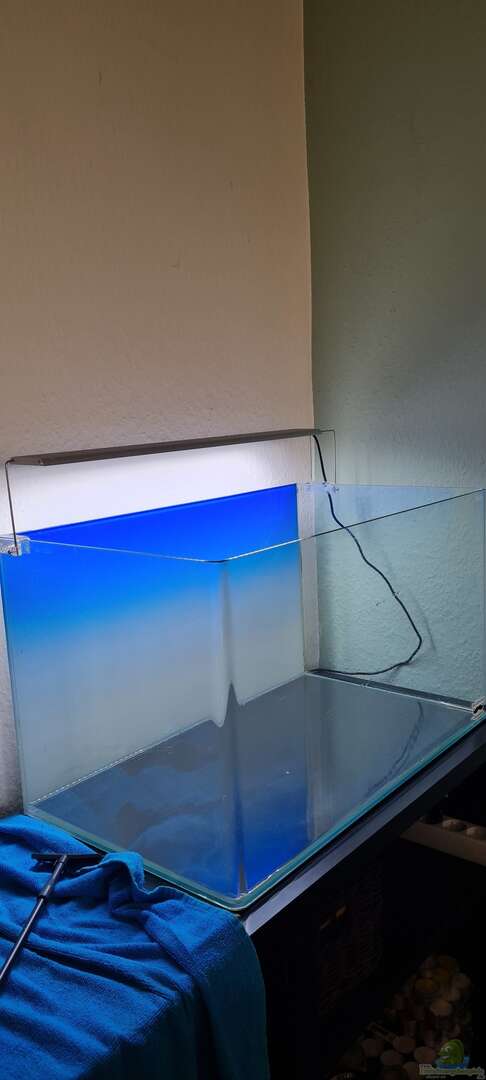 Dieses ist ein Blau "Cubic Nano"Aquarium. Es hat abgerundete Kanten im vorderen Bereich. Diese sorgen für eine schöne Frontalansicht. Das Aquarium wurde im Wohnzimmer auf einem Sideboard aufgestellt.