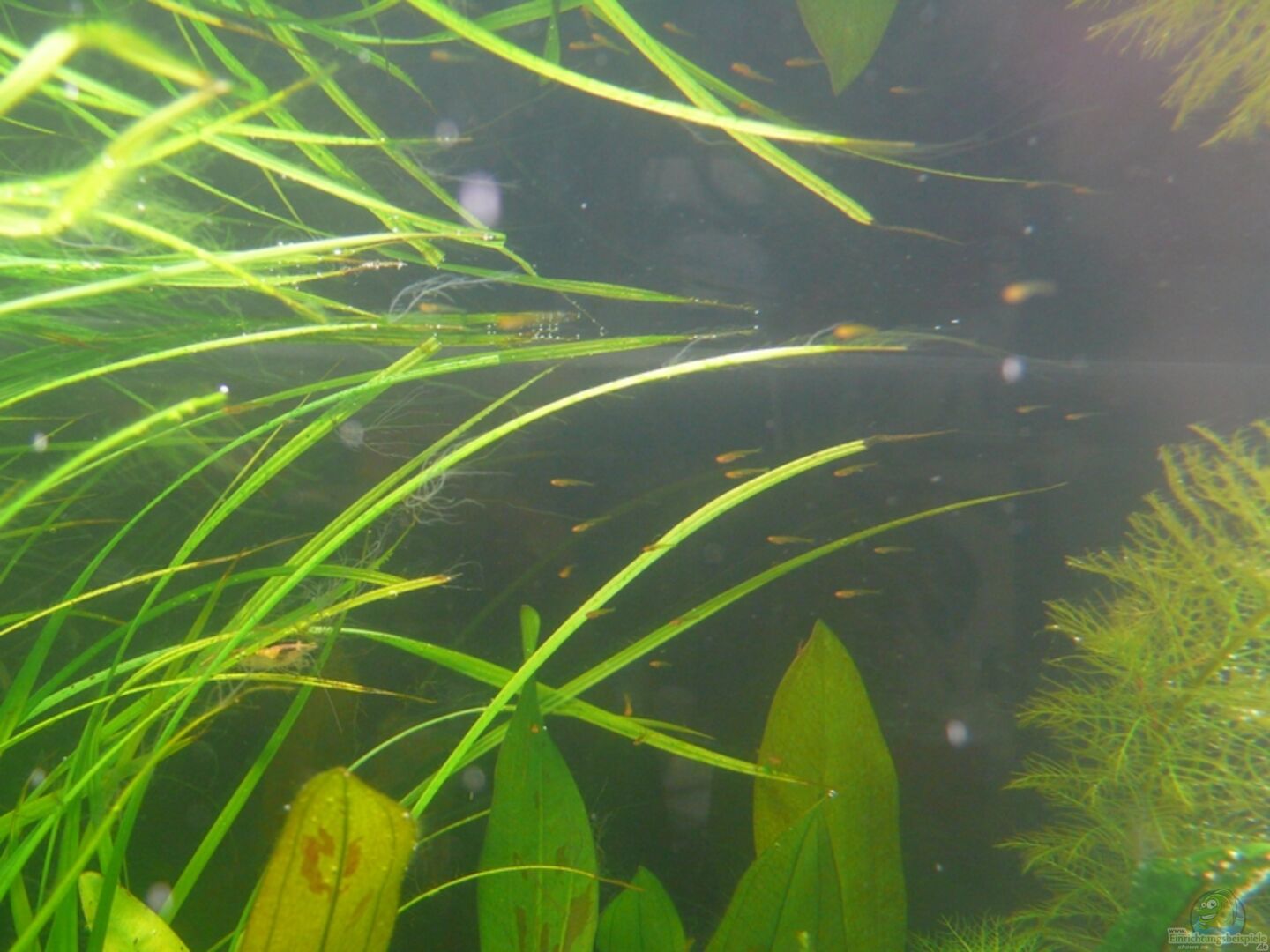 Wie Ihr an den Bildern sehen könnt, hat es 18 Tage nach der Ersteinrichtung gedauert bis ich die erste ungewollte Nachzucht im Becken entdeckte. Nach ein paar Tagen hatte ich 31 kleine Glühlichtdanios gezählt. ??berlebt haben davon 22. Das so viele Jungtiere überlebt haben ist eigentlich der Grünalgenplage (Schwebealgen, später dann Fadenalgen) zu verdanken, da die Tiere sich davon ernährt haben müssen. Jedenfalls waren die Bäuche immer rund, wodurch ich mir jeglichen Aufwand einer speziellen Fütterung ersparen konnte. Es kamen weitere 31 kleine Danios dazu, von denen aber keine überlebte. Gründe sehe ich im Entfernen stark veralgter Blätter, wodurch ein gewisser Schutz fehlte und das durch mehrfachen Wasserwechsel erfolgreiche Zurückdrängen der Grünalgen und somit, falls meine Annahme stimmt, kein geeignetes Futter vorhanden war.