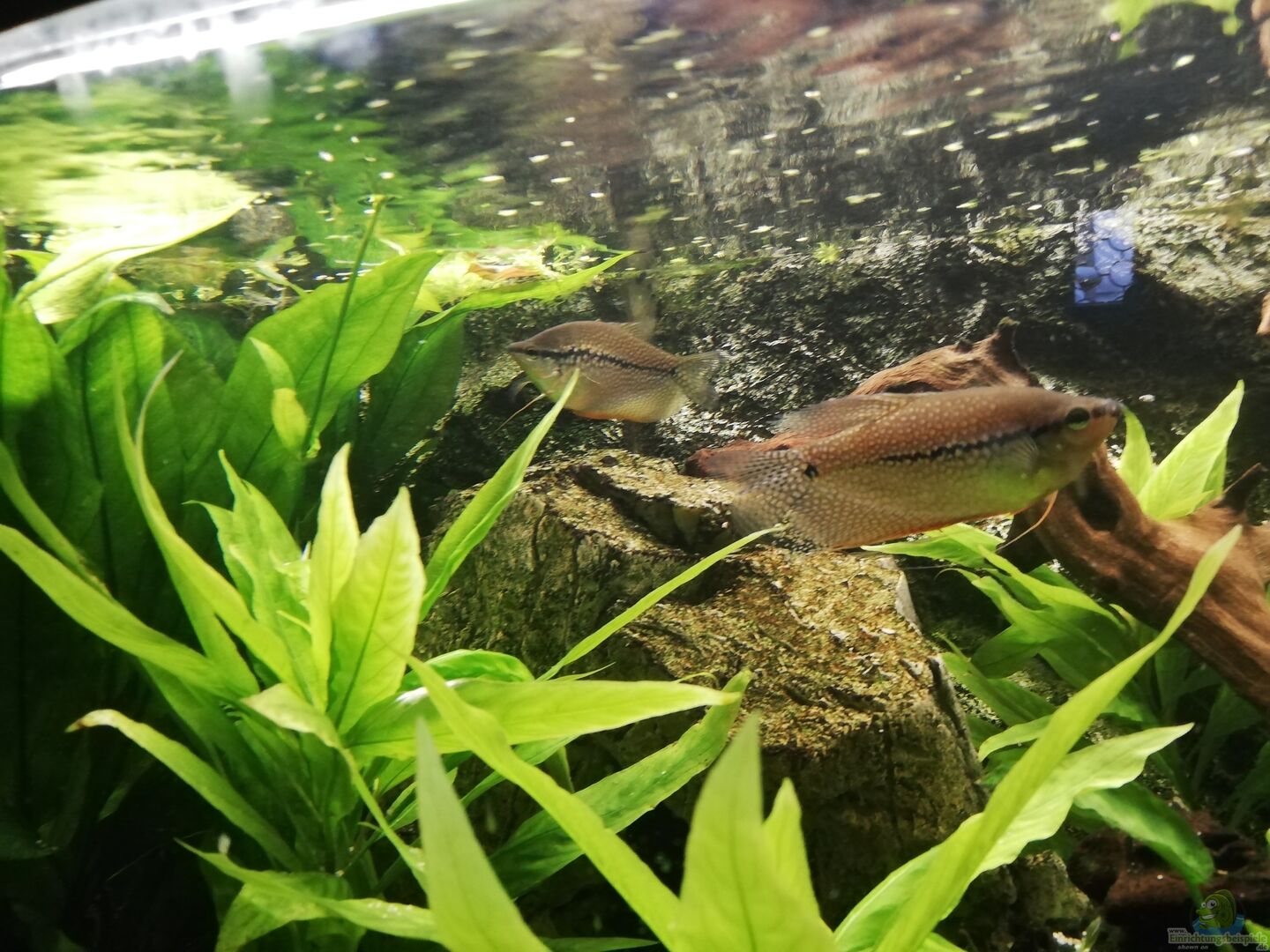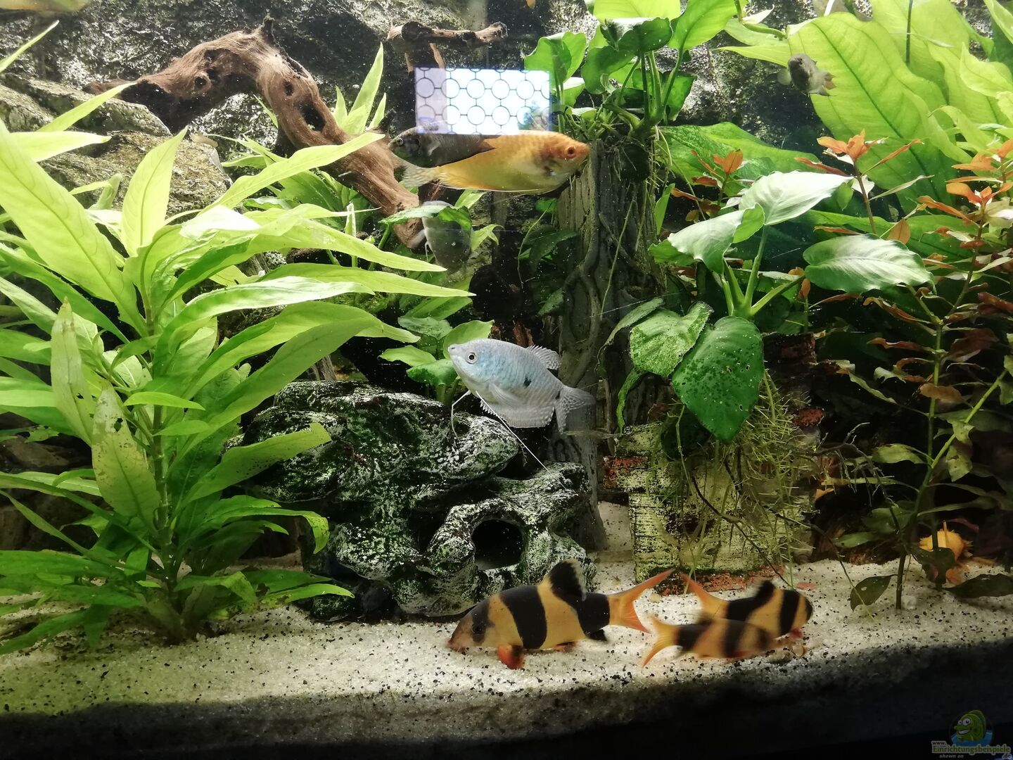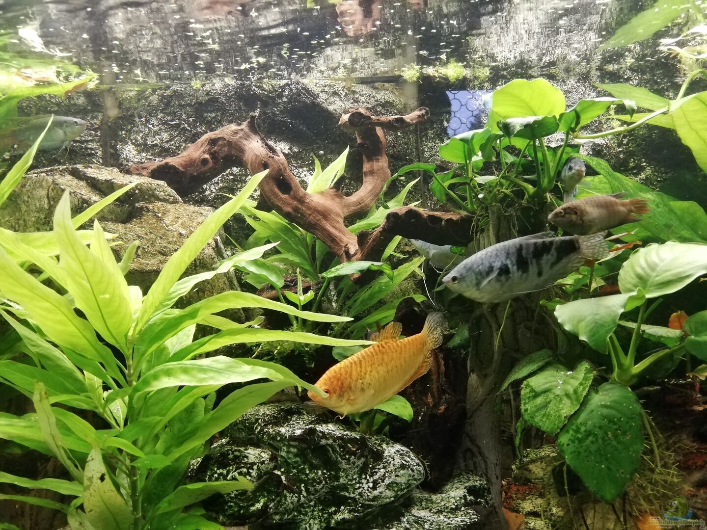 Besatz Grosses Becken: 5x Goldener Antennen welse, 5x panzerwelse, 2x grüner fransenlippler geschlecht unbekannt.3x Mosaik fadenfische., 4x Fadenfisch gelb, rot und 2x blau und 12 paradiesfische 11 aus einer nachzucht hier, das weibchen leider nach der eiablage gestorben, 5x Prachtschmerlen noch klein.Die Faden und Paradiesfische und die goldfarbenen Welse wohl auch zumindet tut sich da mit der grösse nix mehr. sind ausgewachsen