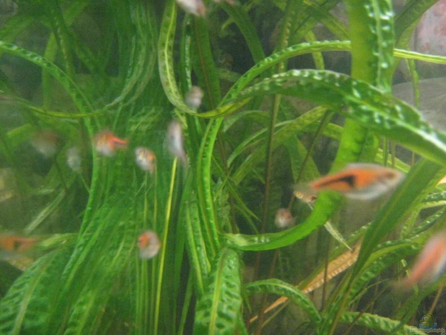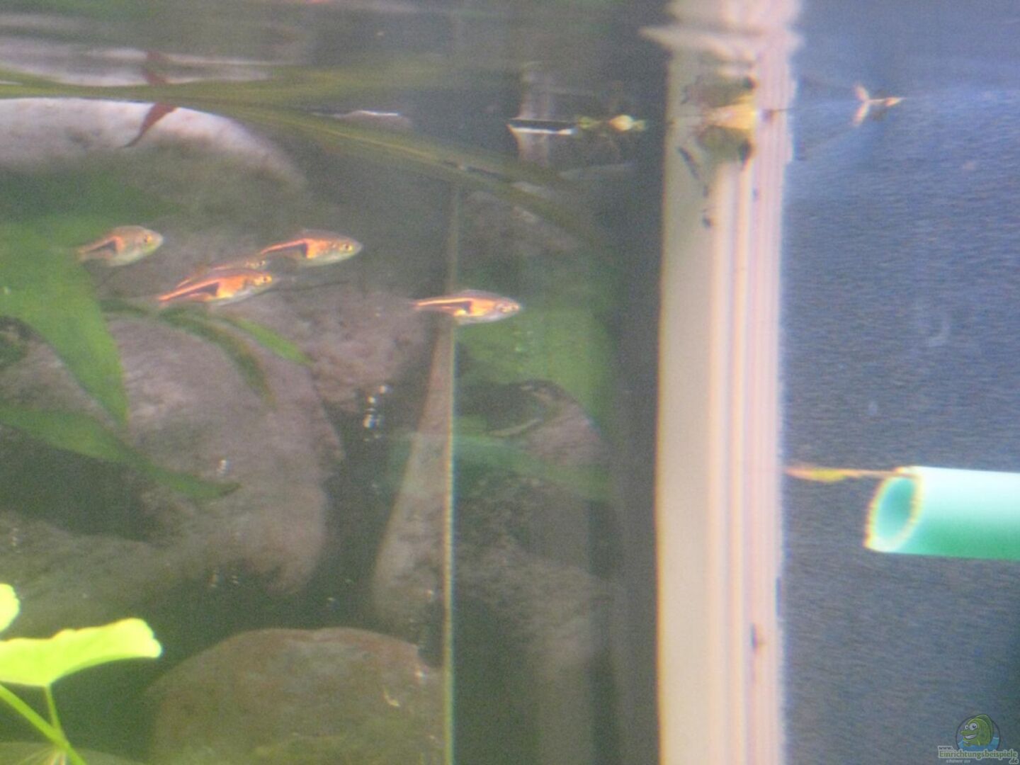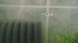 Endlich hab ich mal Nachwuchs bekommen. Bei mir aben sich die Trigonostigma espei vermehrt. Ich habe vor ca. 5 Wochen 4 klitze kleine Punkte in der Ströhmung stehen gesehen und konnte meinen Augen kaum glauben. I wu??te erst nicht genau welcher Fisch das sein könnte, aber da sich mein Besatz ja sehr beschränkt konnte es sichnur um Espeis handeln. Ich hab gelesen, dass sie ihre Jungen nicht fressen, aber um die ??berlebenschancen zu sichern hab ich sie aus dem Becken rausgesaugt und sie dann in einen in diesem Becken instalierten Netzbrutkasten getan. Dann hab ich sie mit Atemianaupliten gefüttert-leider musste ich dann für 2 Wochen in den Urlaub und mein Nachtbar konnte sie nur 1x täglich mit tetramin baby füttern, ich glaub desshlab sind in dieser Zeit nicht ganz so stark gewachen. Jedenfalls haben 2 von 4 überlebt und sie sind jetzt ca. 1cm gro??. Gersten hab ich sie dann in ein 10Liter babybecken gesetzt wo sie noch etwas wachsen können um sie dann später zu ihren Eltern zu setzen:)