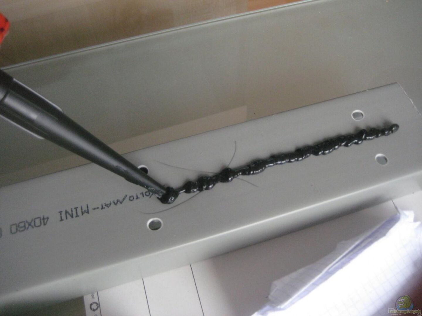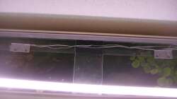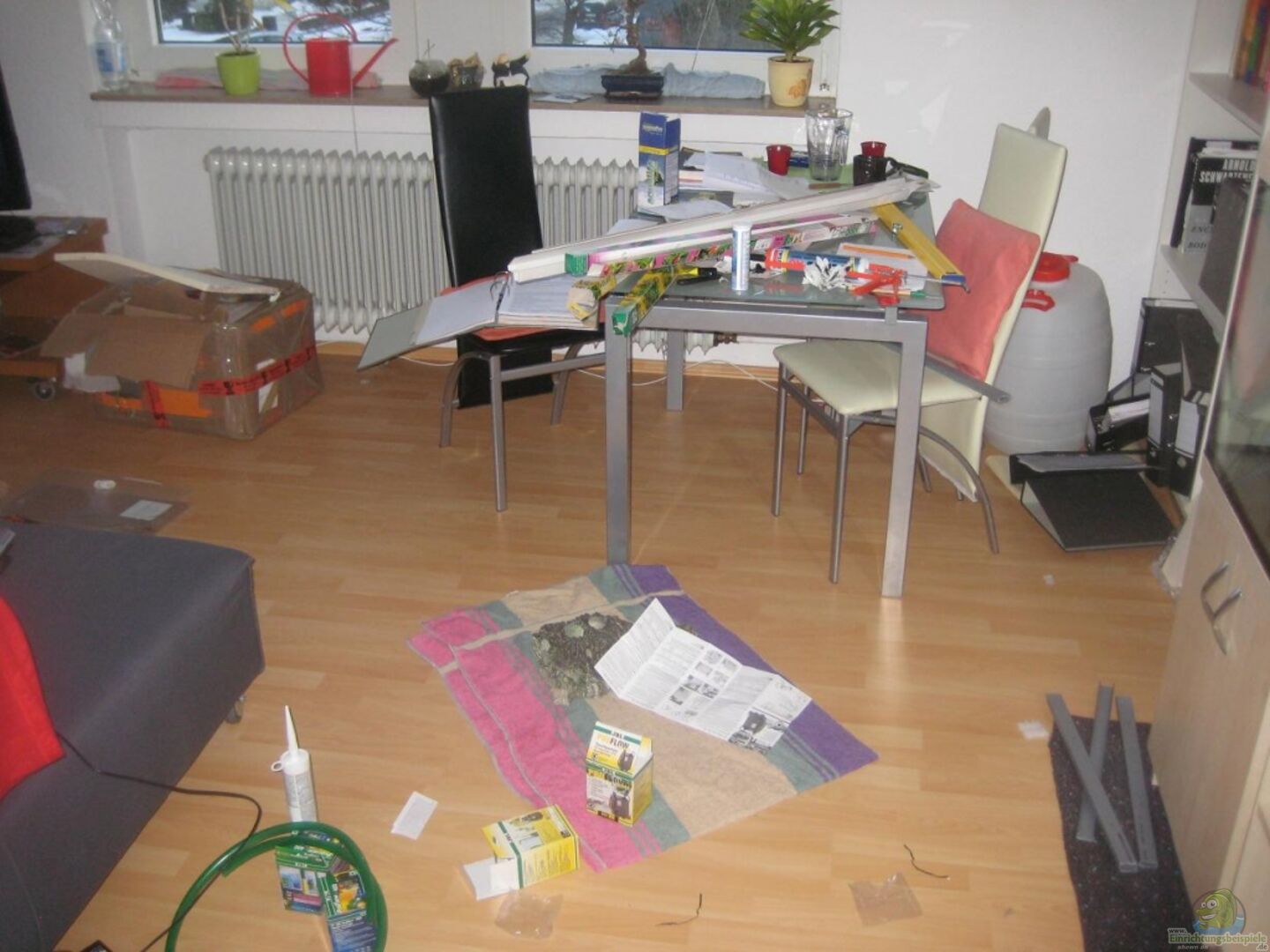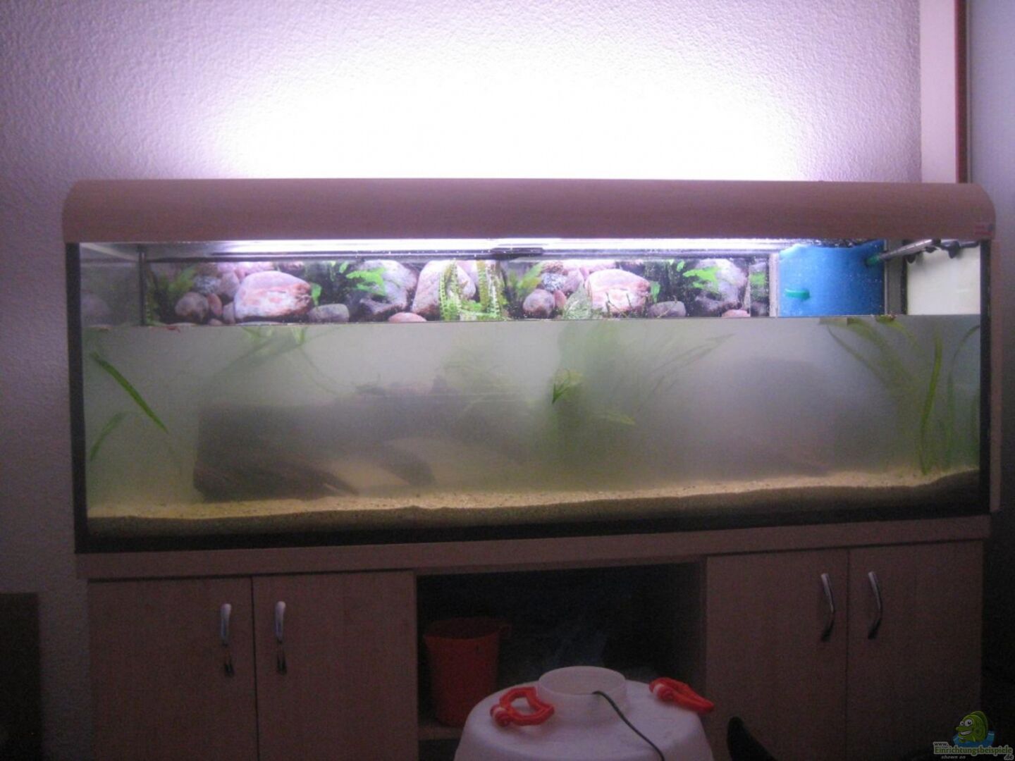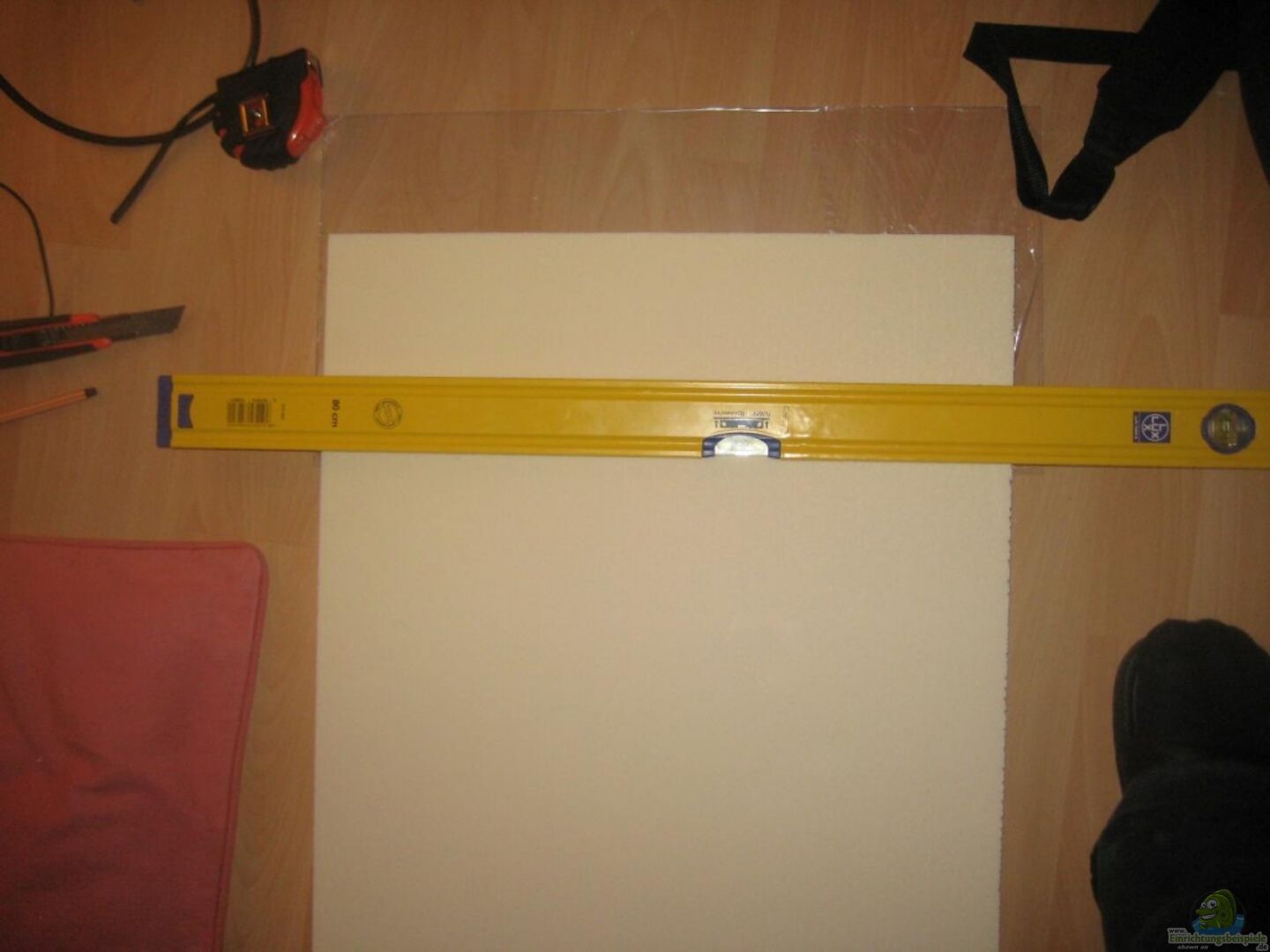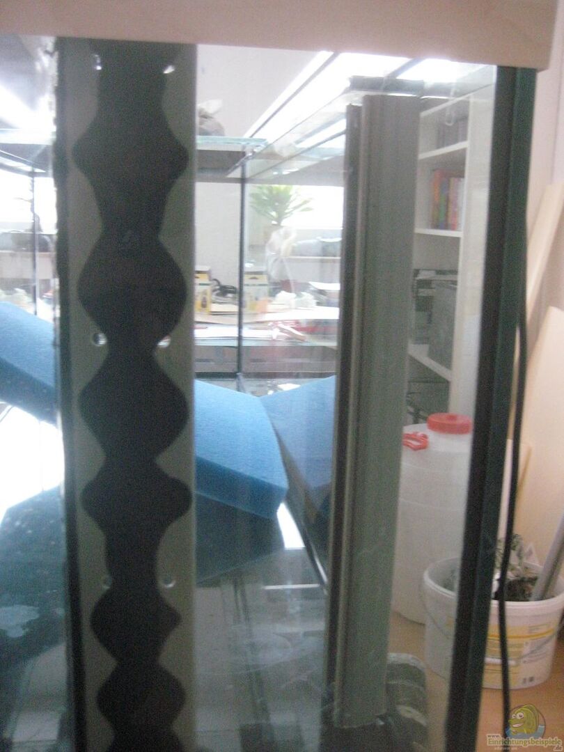 -Das Aquarium ist an der hinteren längs- , sowie an der rechten Seitenscheibe wärmegerdämmt um so den Stromverbrauch zur Beheizung des Beckens zu reduzieren. Dazu wurden jeweils, passend zur Scheibengrö??e, Styroporschaumplatten mit Silikon verklebt.