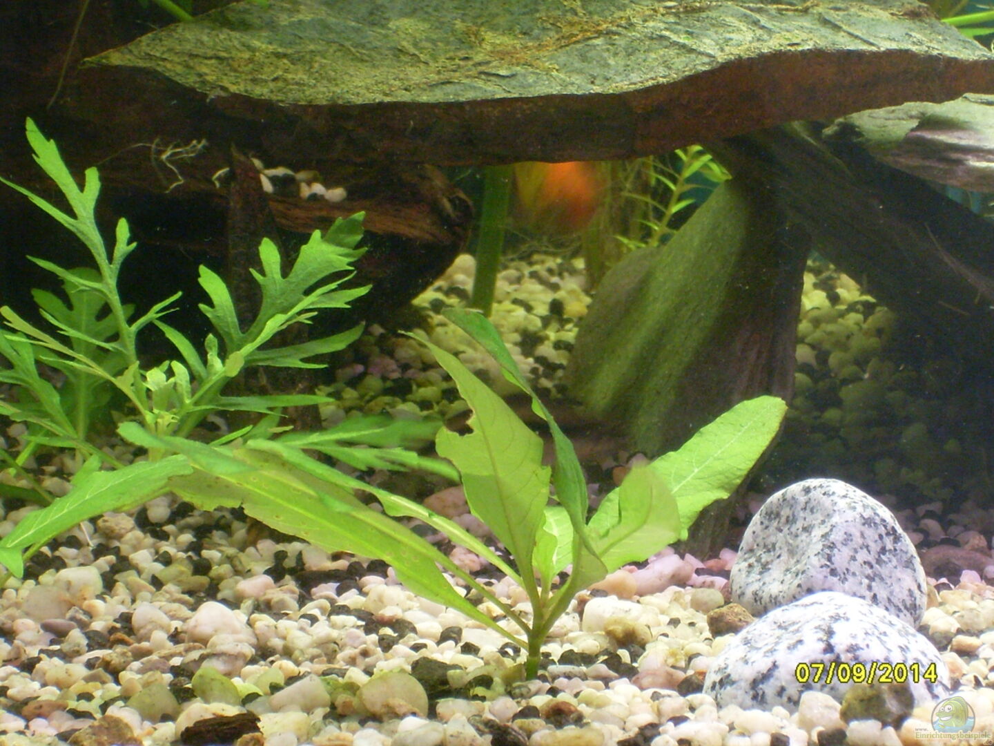 Au??erdem hab ich die Einrichtung letzte Woche geändert, mehrere gro??e Steine und viele kleine Kieselsteine in verschiedenen Farben sind ins Becken gekommen. Jetzt sieht der Vordergrund nicht mehr so kahl aus.