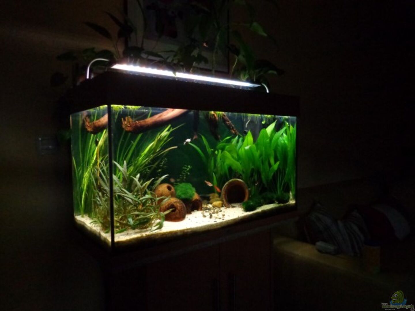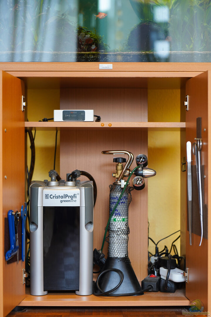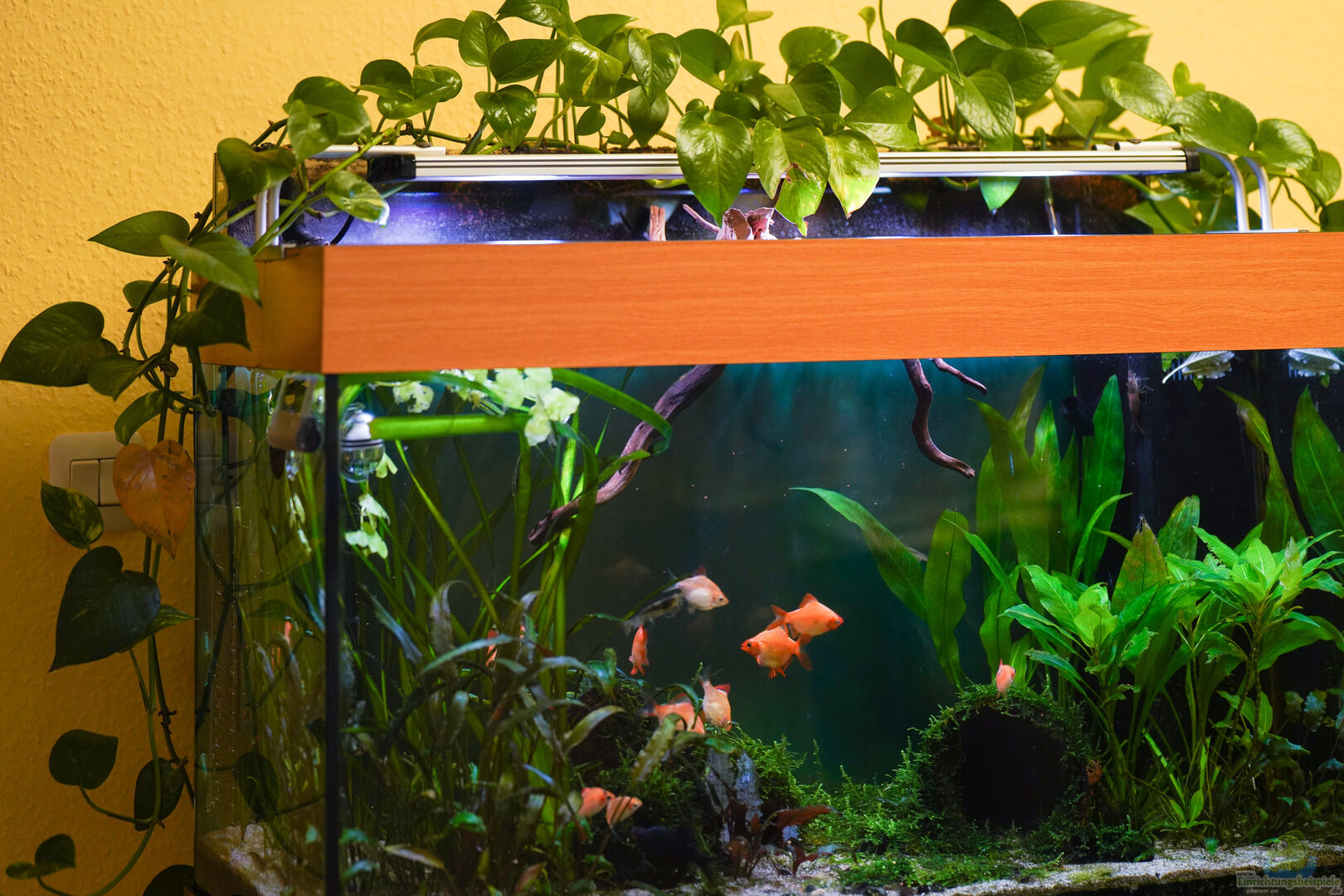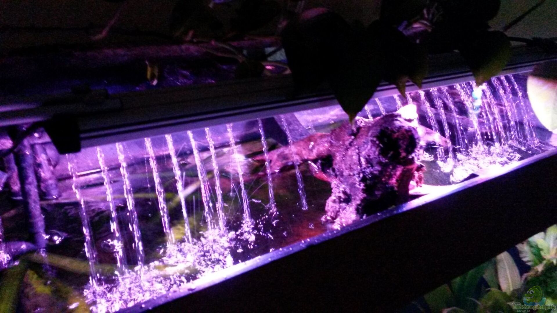 Es handelt sich um ein Juwel Rio 125 Standardbecken, welches offen mit nachgerüstetem LED-Licht und ma??angefertigter Glaspflanzrinne betrieben wird, dessen Pflanzen durch eine zusätzliche Pumpe mit Aquarienwasser versorgt werden. Es handelt sich um ein reines asiatisches Artenbecken.