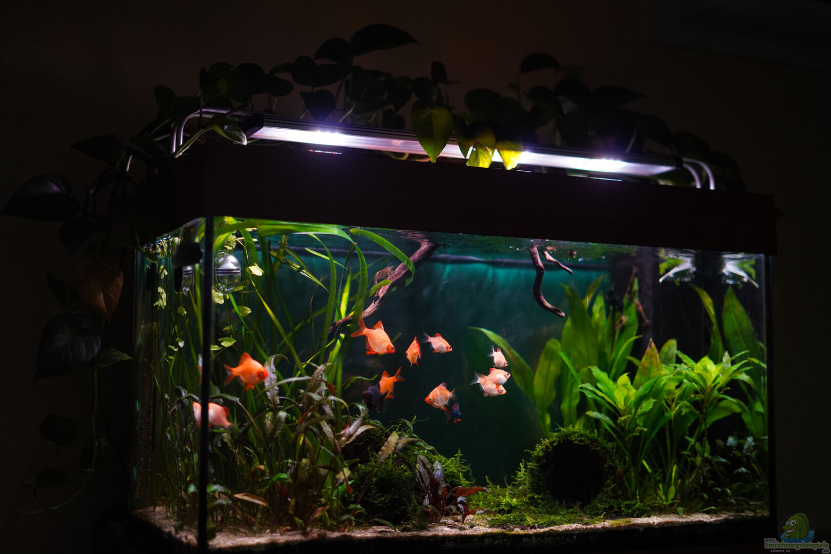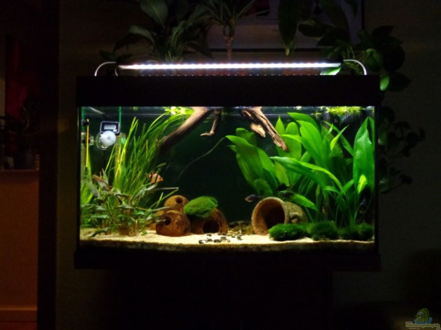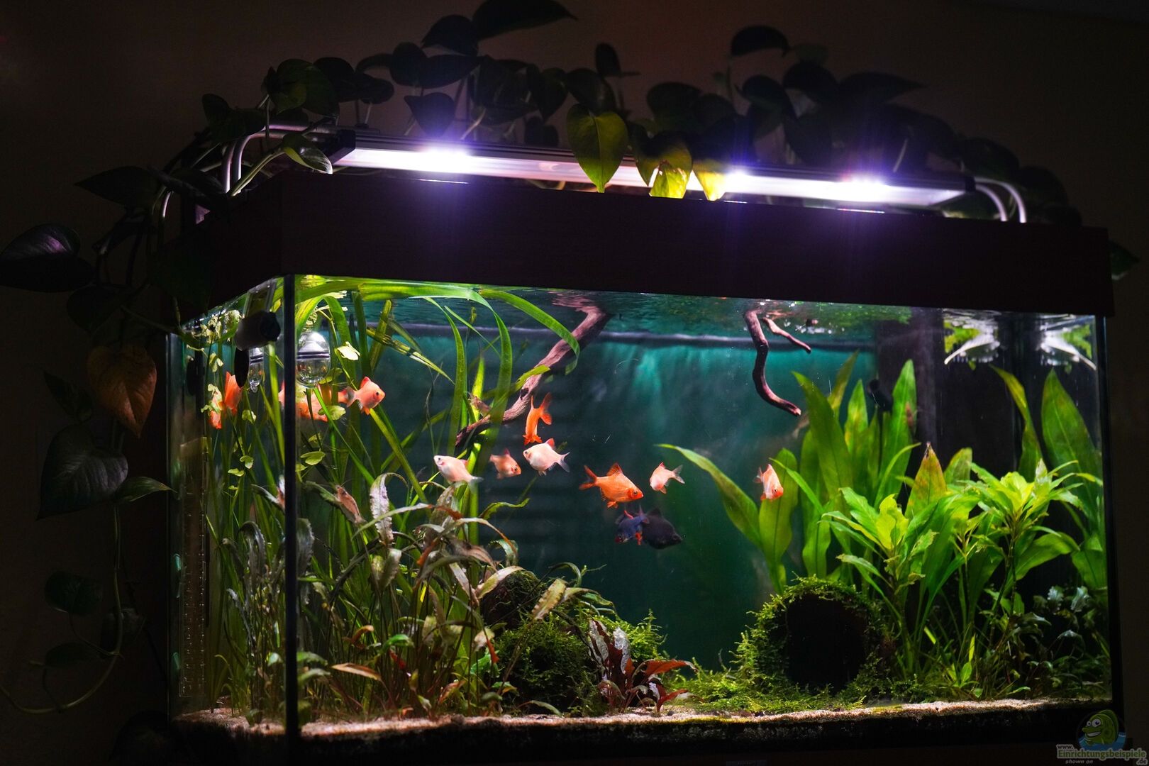 Es handelt sich um ein Juwel Rio 125 Standardbecken, welches offen mit nachgerüstetem LED-Licht und ma??angefertigter Glaspflanzrinne betrieben wird, dessen Pflanzen durch eine zusätzliche Pumpe mit Aquarienwasser versorgt werden. Es handelt sich um ein reines asiatisches Artenbecken.