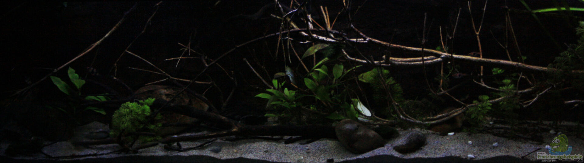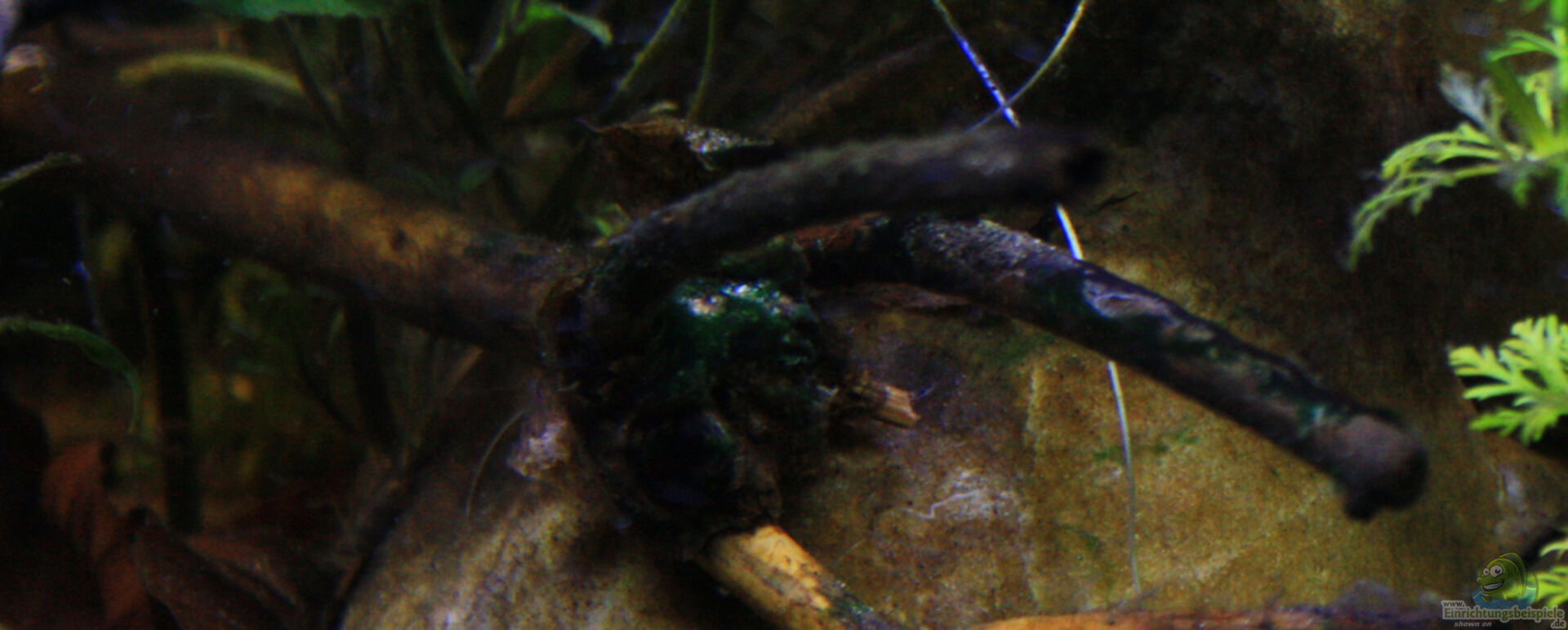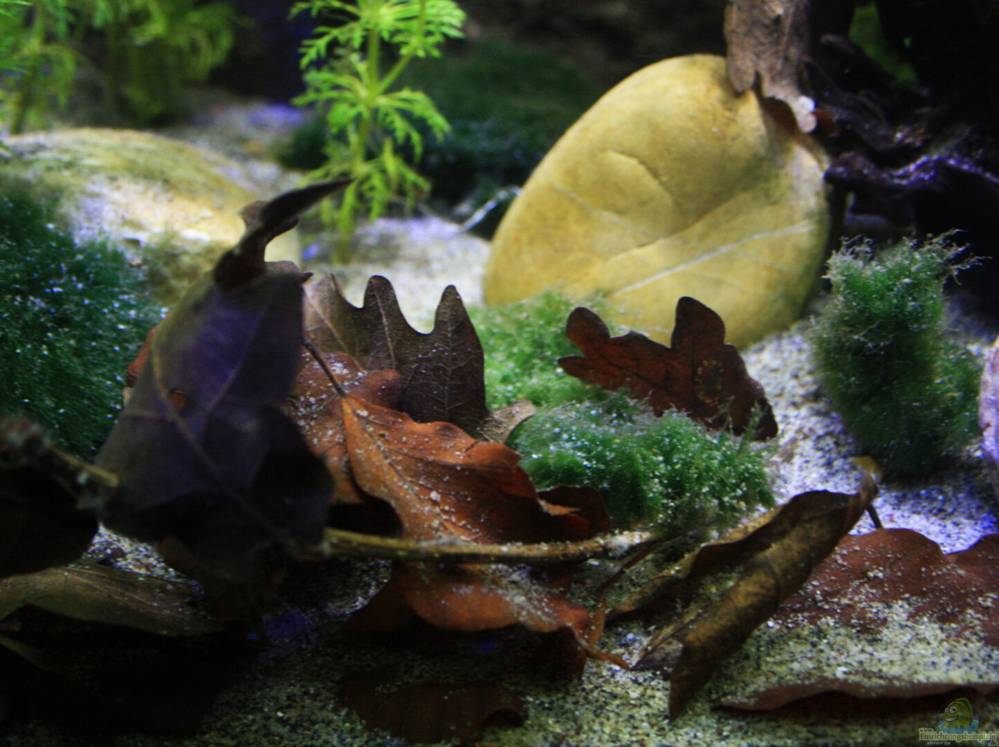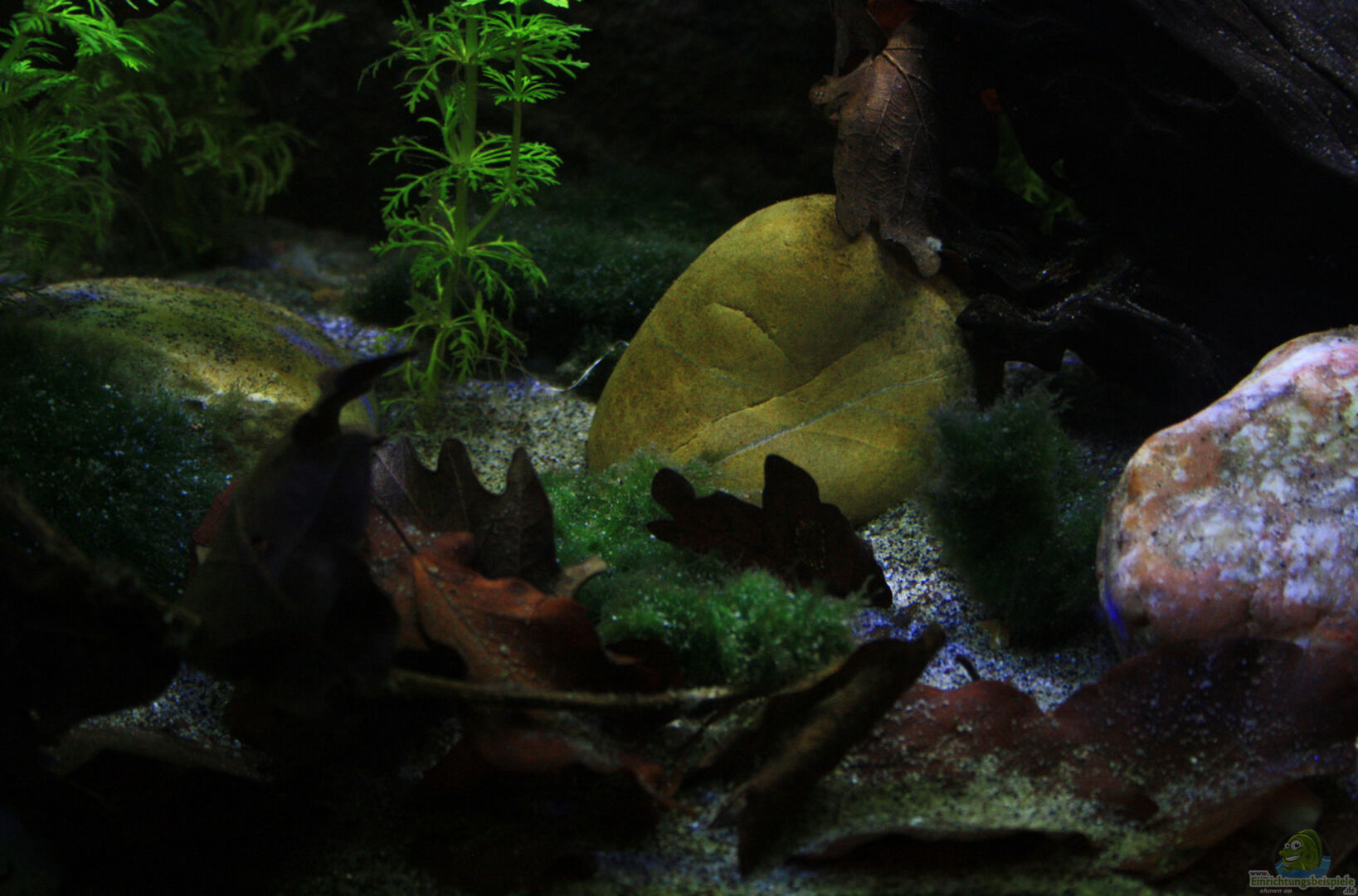 Dabei wurde der Bodengrund wie ein kleiner Abhang angelegt der nach vorne leicht abfällt, überall liegt Laub dazwischen und Moose wurden wahllos ins Becken dekoriert, dabei entstanden teilweise Lichte Zonen und gleichzeitig Verstecke für die Dornaugen.