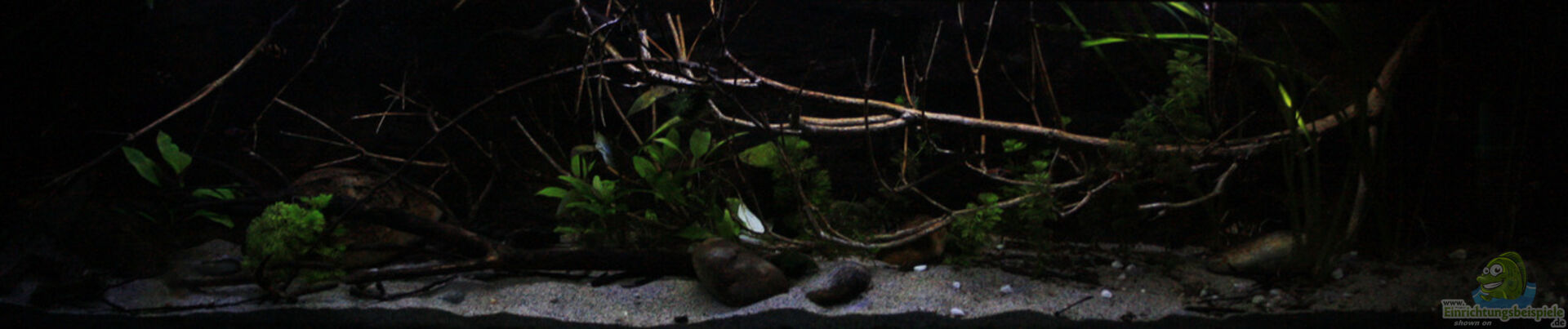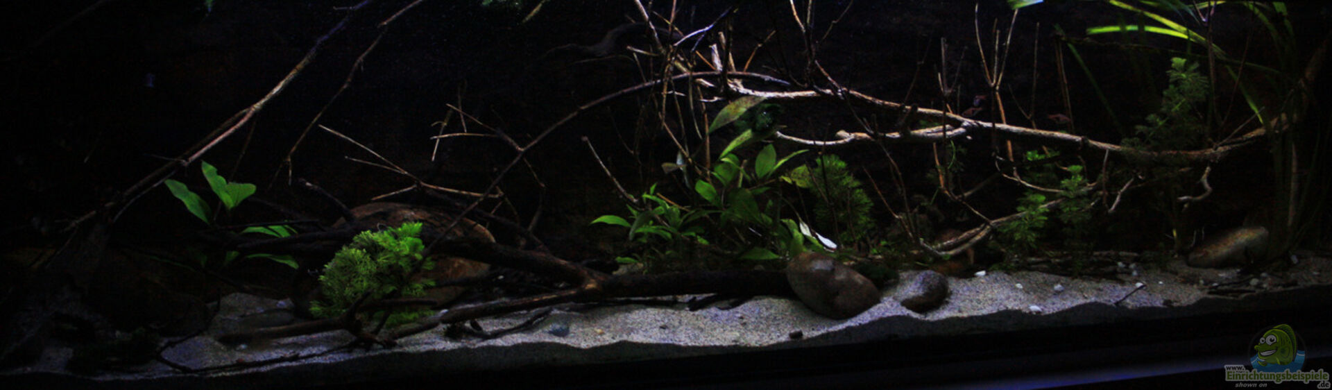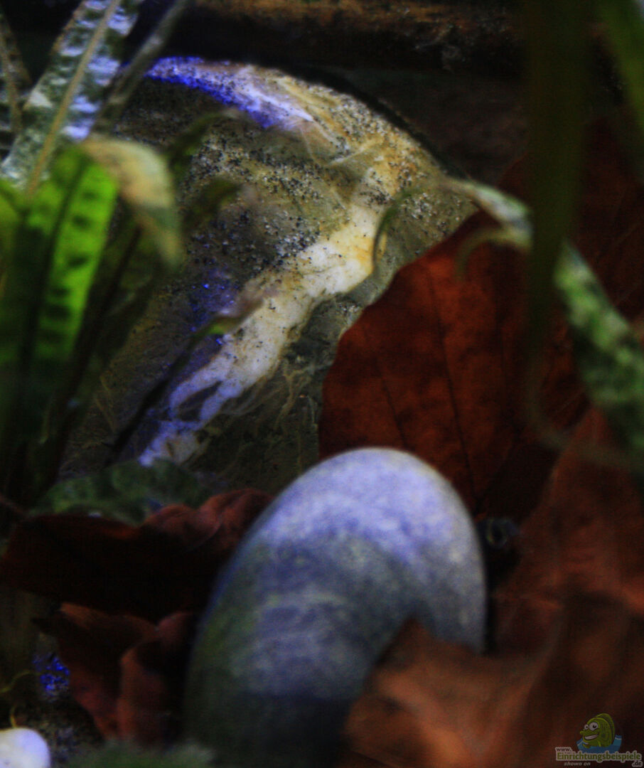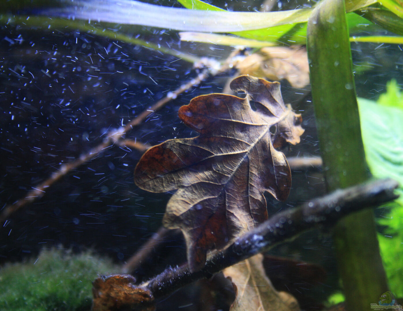 Dabei wurde der Bodengrund wie ein kleiner Abhang angelegt der nach vorne leicht abfällt, überall liegt Laub dazwischen und Moose wurden wahllos ins Becken dekoriert, dabei entstanden teilweise Lichte Zonen und gleichzeitig Verstecke für die Dornaugen.