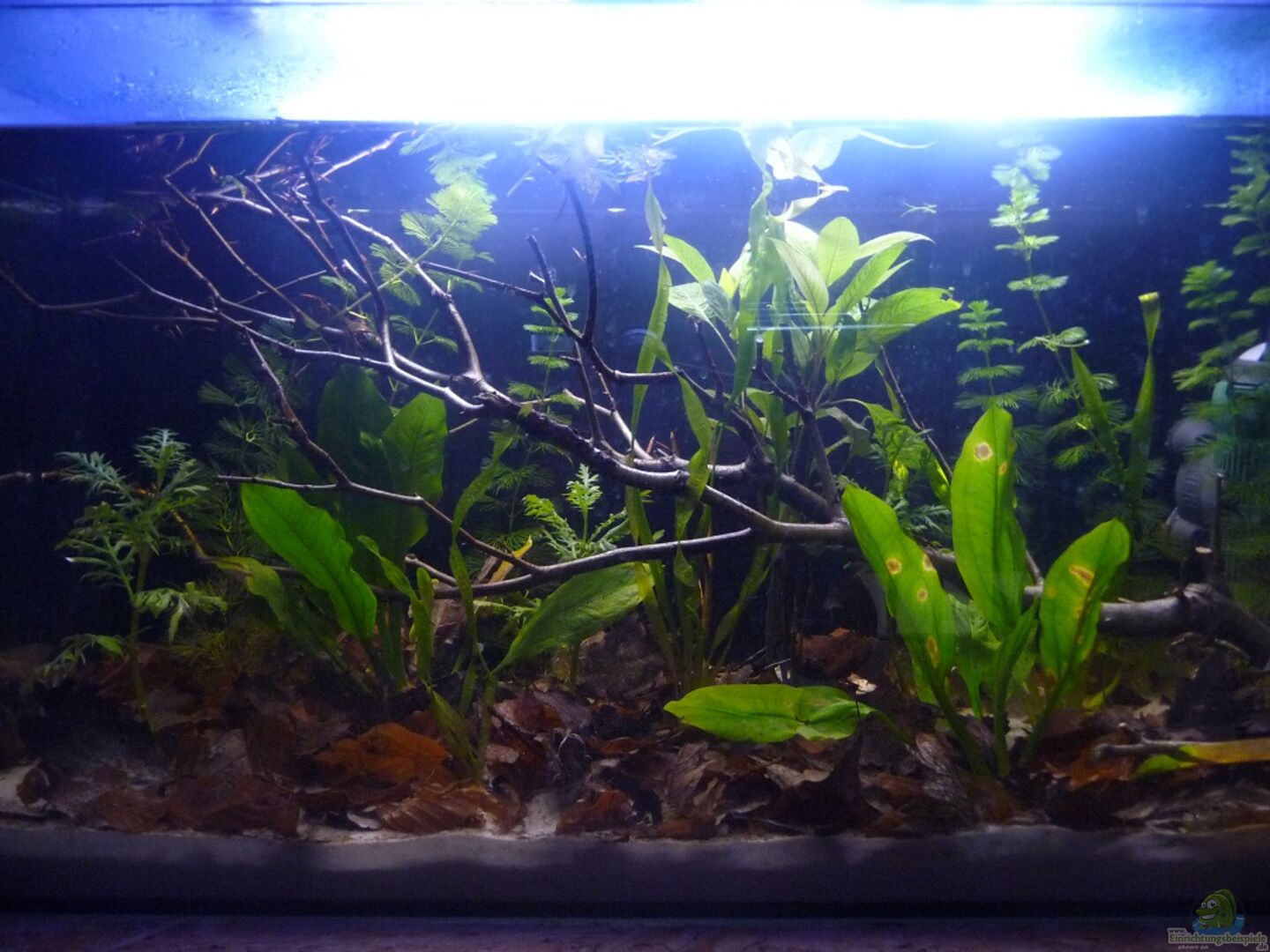 Das Aquarium ist anstatt einer herkömmlichen Abdeckung mit einer Glasscheibe abgedeckt, die Leuchtstoffröhre liegt direkt auf der Abdeckscheibe. Darüber ist eine selbtgebaute Lichtblende aus schwarzen Holzleisten, die innen mit Alufolie beklebt ist.
