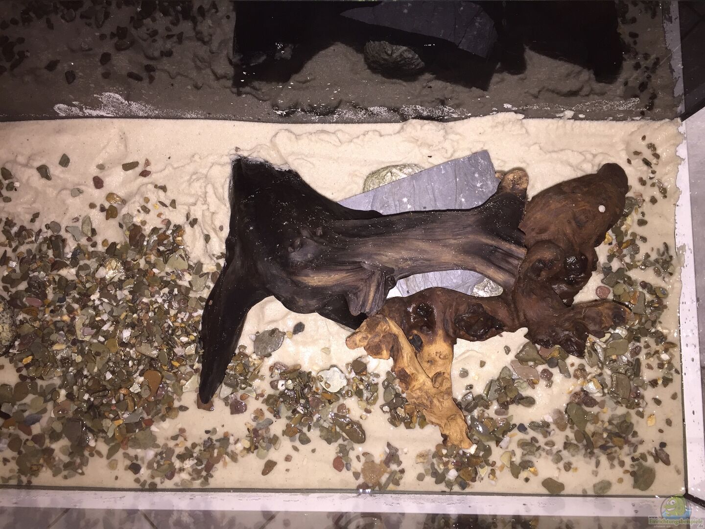 ca. 35 kg feiner Spielkastensand aus dem Baumarkt. Darauf verstreut Dennerle Rio Xingu Kies. Dies gibt eine schöne und natürliche Optik und der Bodengrund wirkt nicht zu grell.