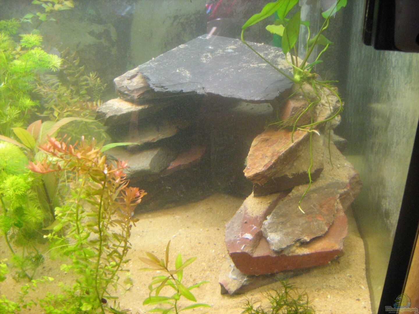 Die Steine wurden im Thüringer Schiefergebirge selbst gesammelt (falls jemand in die Nähe kommt und auch sammeln will die B281 Eisfeld - Neuhaus am Rennweg bietet sich da sehr gut an). Anschlie??end wurden sie Zuhause aussortiert und dabei genauer untersucht. Von den roten Steine sind viele rausgeflogen aber ein paar wenige hab ich riskiert mit einzusetzen. Nach über 1 Jahr kann ich nichts negatives über die Steine sagen und würde sie jederzeit wieder verwenden.. Auch grob verschmutze Steine oder welche die eigenartig ausgesehen haben sind sofort wieder raus geflogen. Richtig scharfe Kanten wurden ebenfalls nicht geduldet. Was dann noch übrig geblieben ist wurde abgekocht in einem gro??en Kochtopf. Danach wurden sie 24 Stunden in einem Eimer mit Wasser gelegt um zu gucken ob sie ??l abgeben was bei keinem Stein der Fall war. Erst danach wurden sie mit Aquariumsilikon verklebt und ins Aquarium eingebracht. Die Steinhöhlen werden von den Dornaugen sehr gerne angenommen sie wuseln mittlerweile fast nur noch zwischen den Steinen herum.