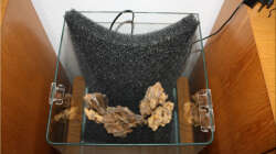 HMF über die komplette Rückwand also Filtermatte 35x35cm mit 20 ppi, Wiltec 300l/h auf niedrigster Stufe also rund 100 l/h