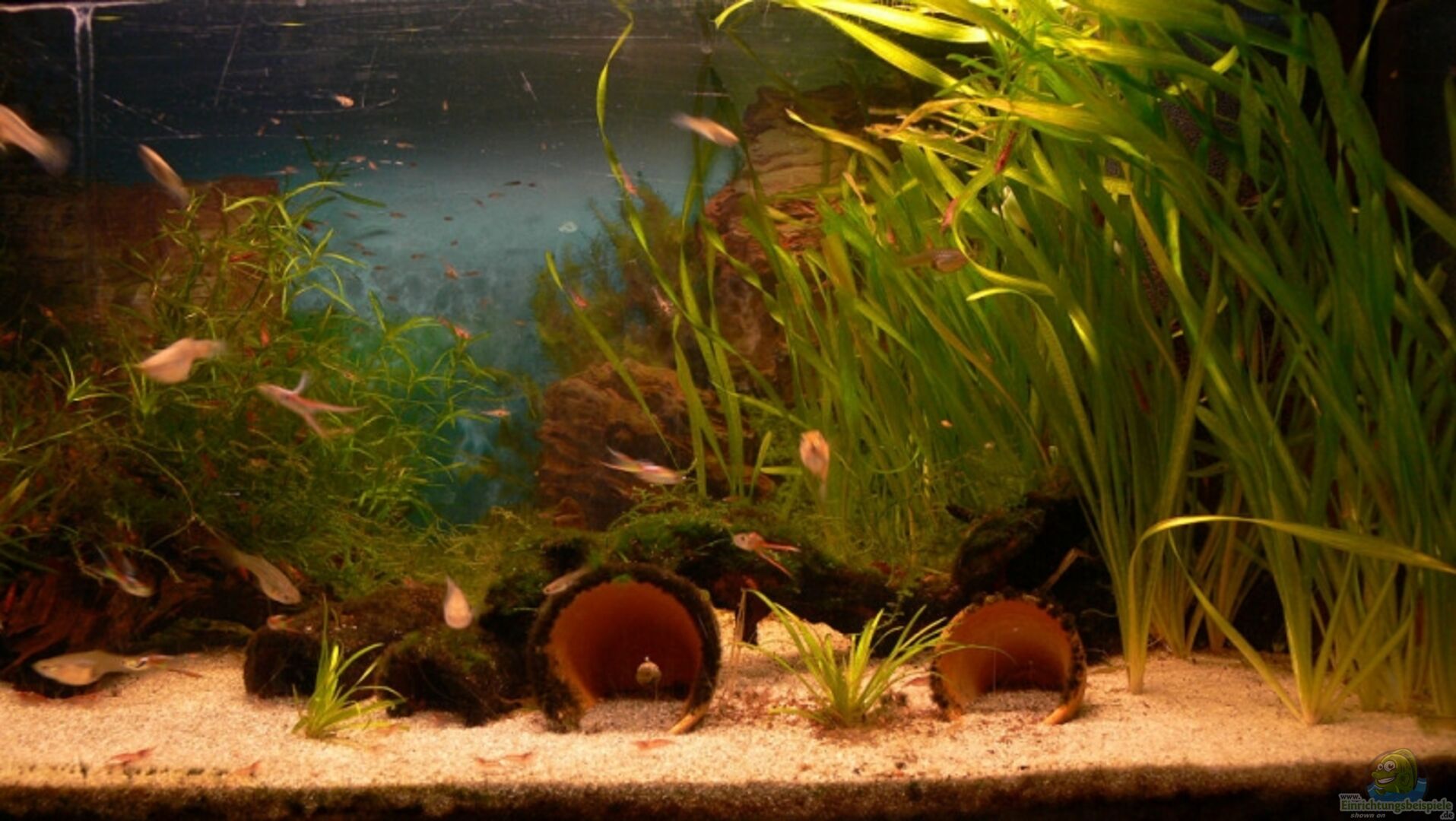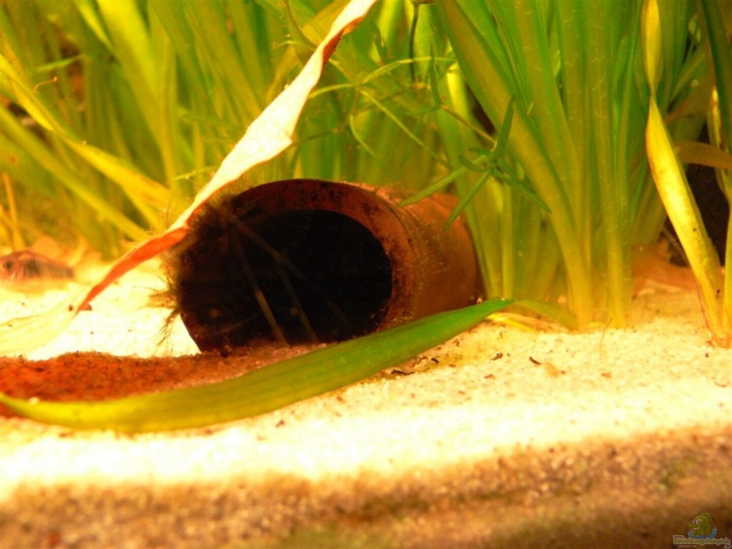 Die Deko in diesem Becken besteht aus mehreren Wurzeln, Höhlen und kleinen Töpfen die als Verstecke dienen.