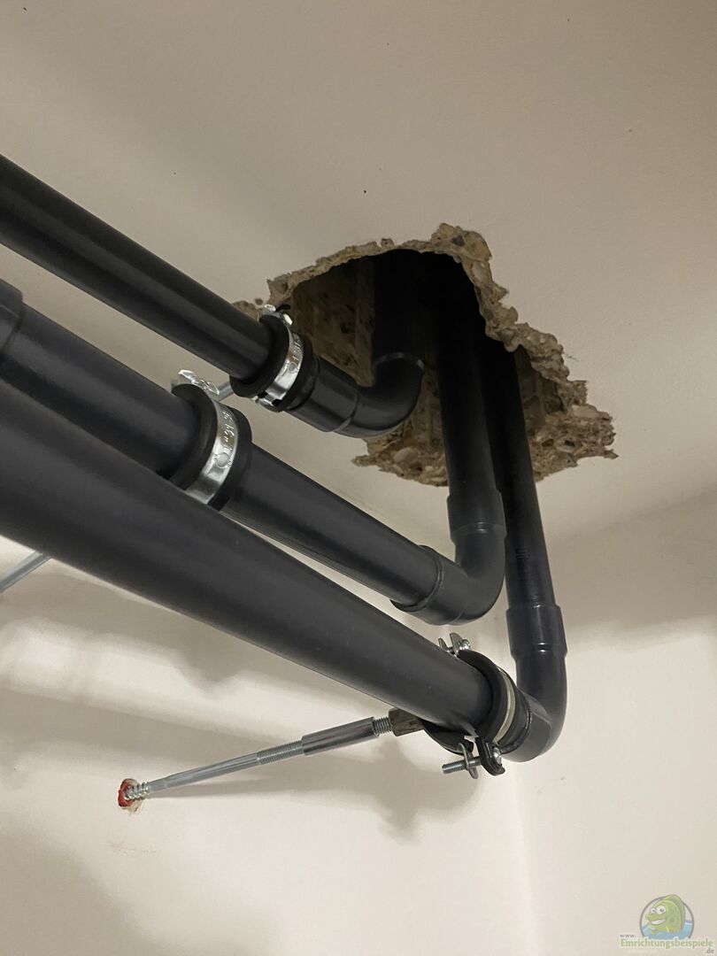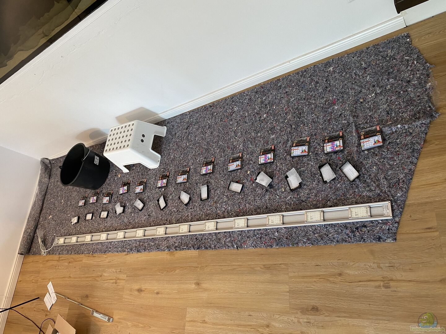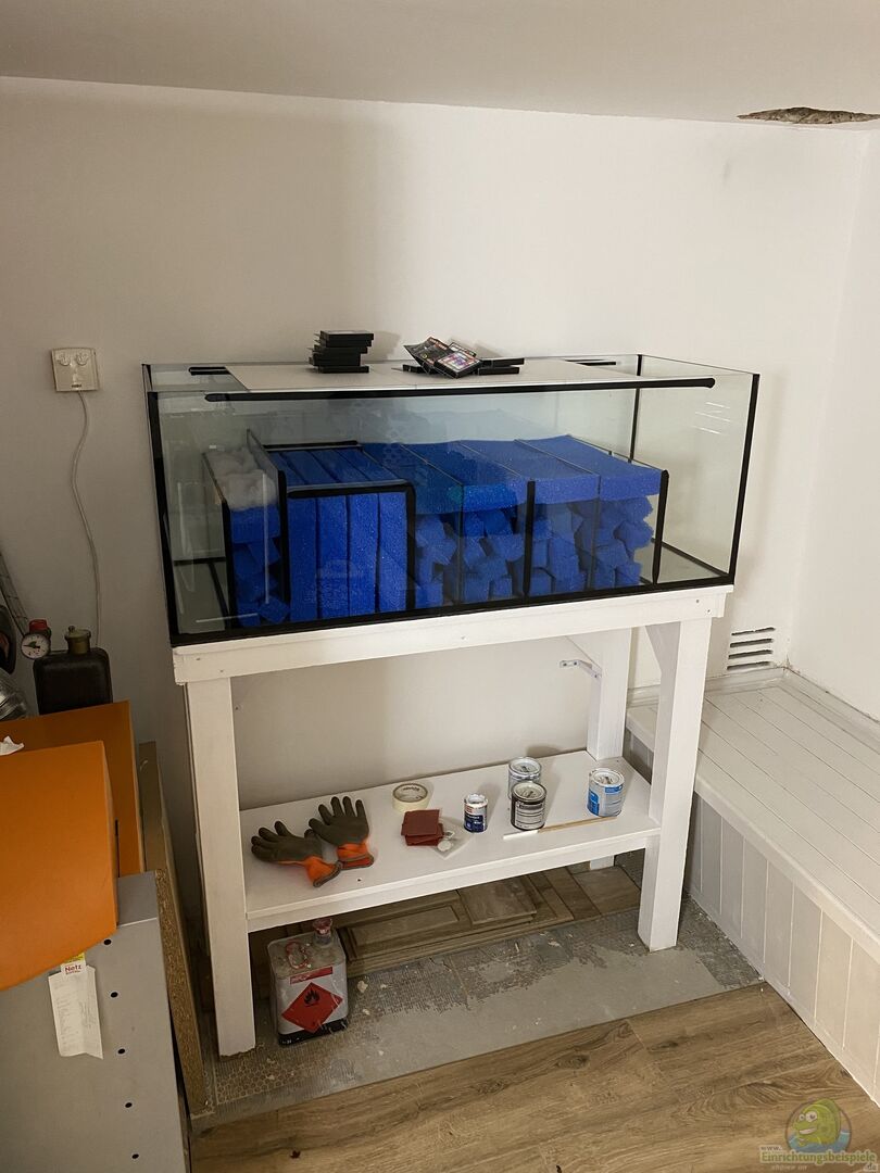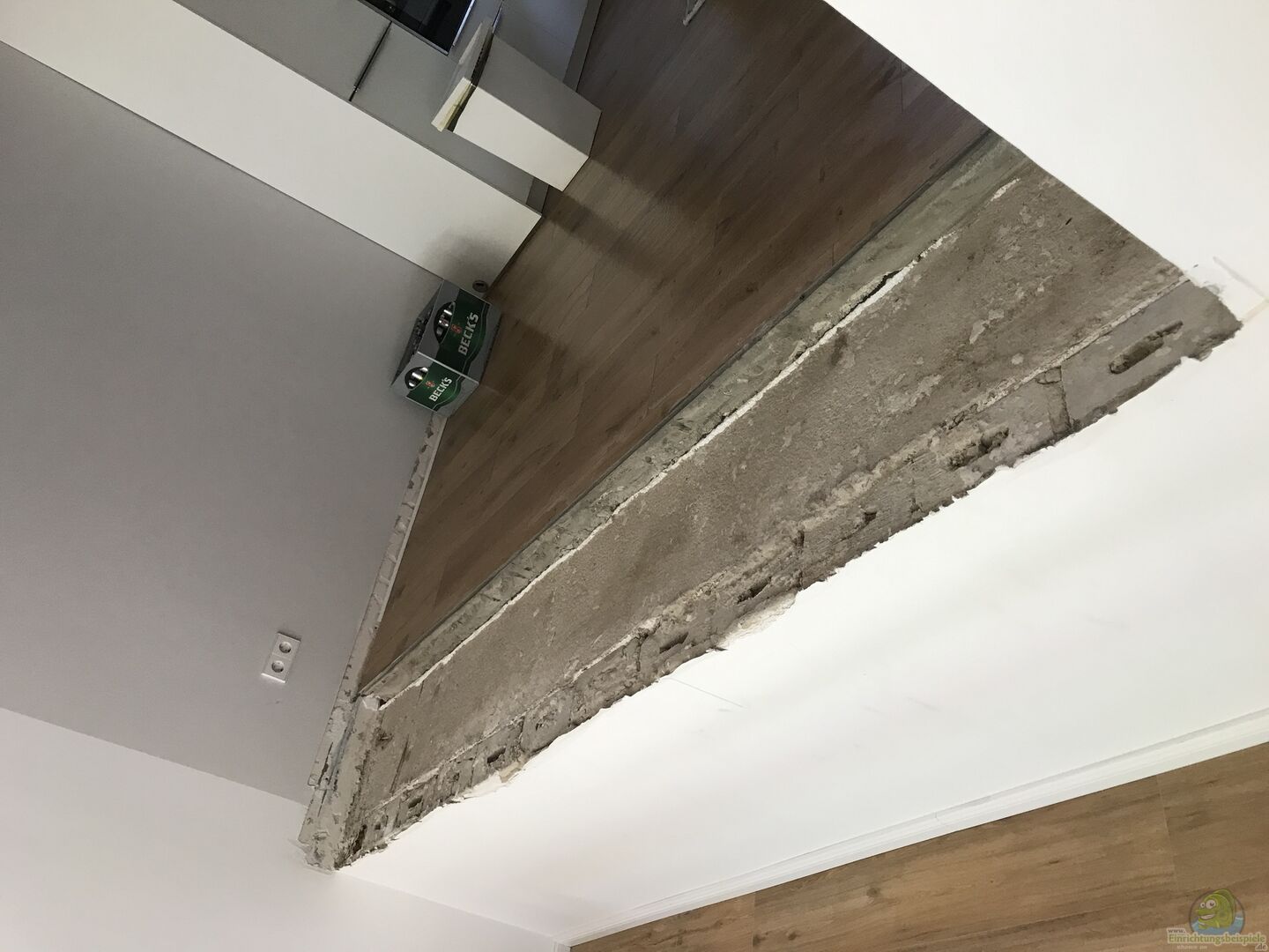 Da das Aquarium in der Küche auf dem Boden steht, mussten umfangreiche Maßnahmen getroffen werden. Der Estrich würde ausgesägt und ein Betonfundament mit der Rohdecke verbunden (Verbundfundament). Das Becken steht auf einer 30mm-starken Siebdruckplatte direkt auf dem Fundament. Zwischen Becken und SBP befindet sich eine Filzunterlage.
