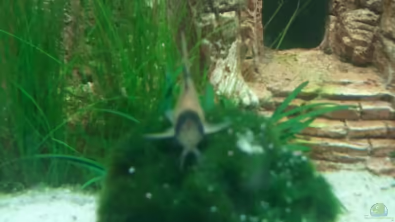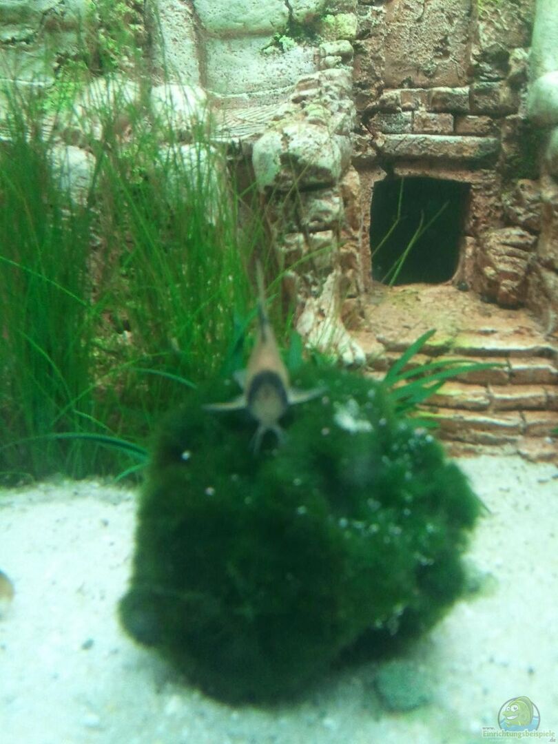 Eine Höhle ist mit mittelgro??en Kieselsteinen für die Dornaugen besetzt und wird gerne angenommen, die zweite bietet platz und Unterschlupf für die Dornaugen und Welse.