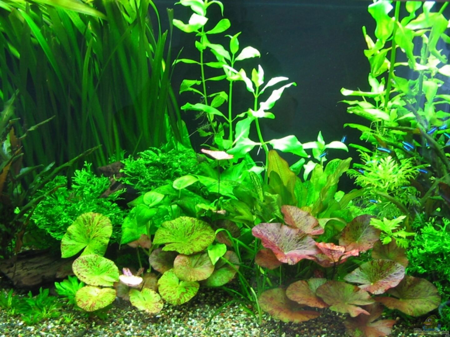 Die Technik allein ist ja schon überwältigend. Das Becken sieht, wie du wahrscheinlich selber wei?t, grandios aus. Tolle Pflanzen, sattes Grün. Was mir besonders gefällt ist, wenn jemand ein derart gro?es Becken hat und den Besatz trotz allem im Zaum hält. Da sieht man den Tierfreund.
