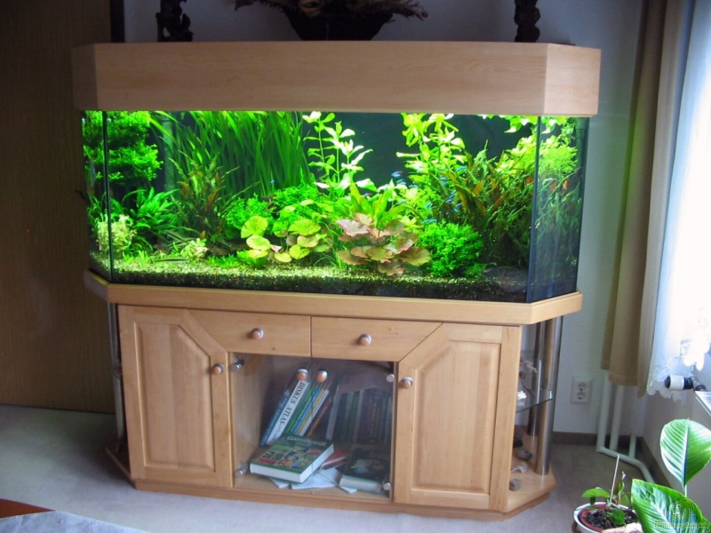 Der Aquariumunterschrank und der Beleuchtungskasten sind kompletter Eigenbau aus Roterle Massivholz (mein Beruf: Möbeltischler) keine Spanplatte o.ä.