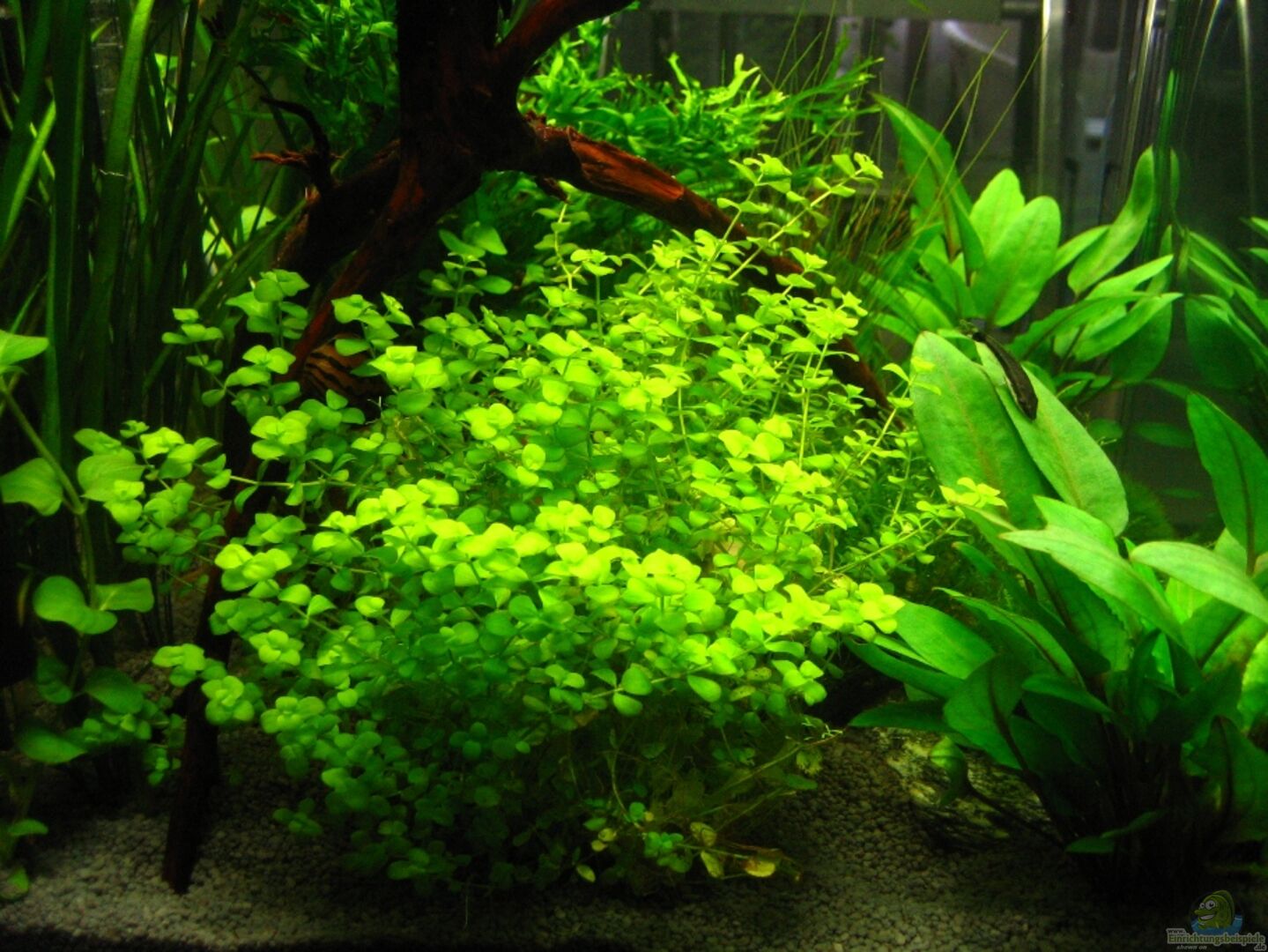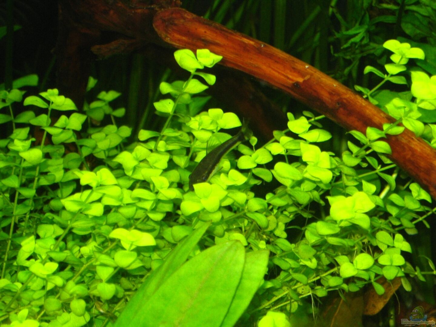 8.7.2010 Schwimmpflanze gekauft, und zwar Aeschynomene fluitans (Wassermimose). Macht sich sehr gut, da das Becken oben offen ist. Und die Salmler-Gruppe erhält auch einen leicht abgeschatteten Bereich im Becken.