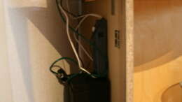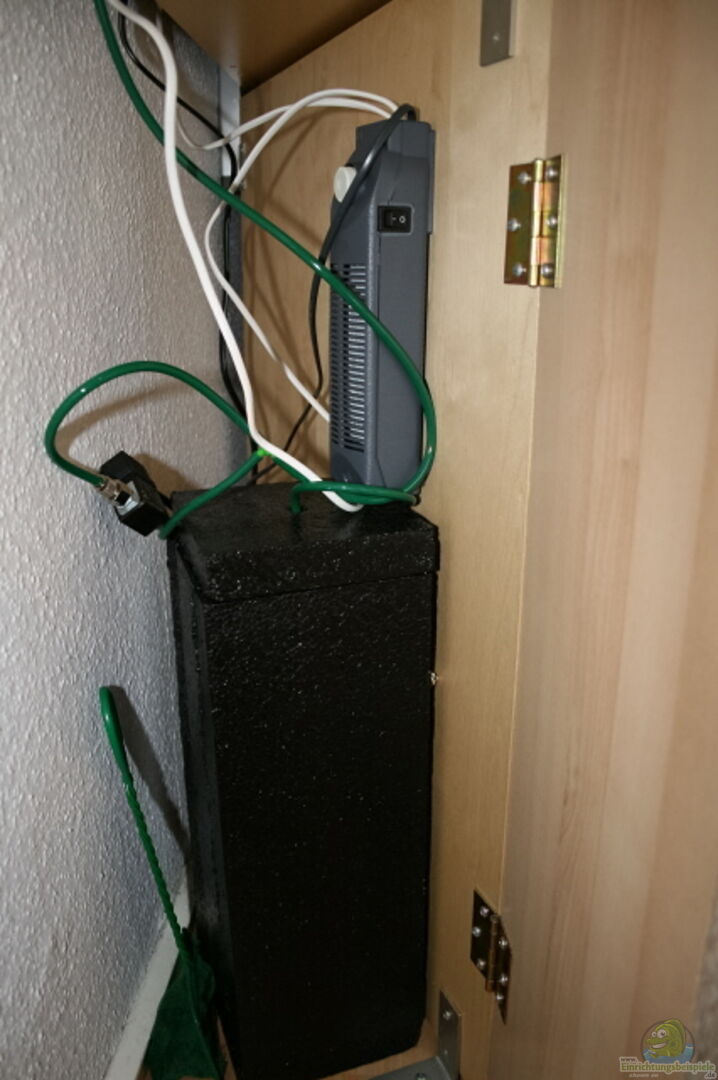 Winkel reicht nicht bis auf den Beckenboden- blaue Matte ist darunter geschoben, so da?? auch eine Ansaugung durch den Bodengrund erfolgt, noch eine Matte aufrecht gestellt, Syporax in Netzbeutel und Conrad- Zimmerspringbrunnenpume für 3.95 und zack- fertig