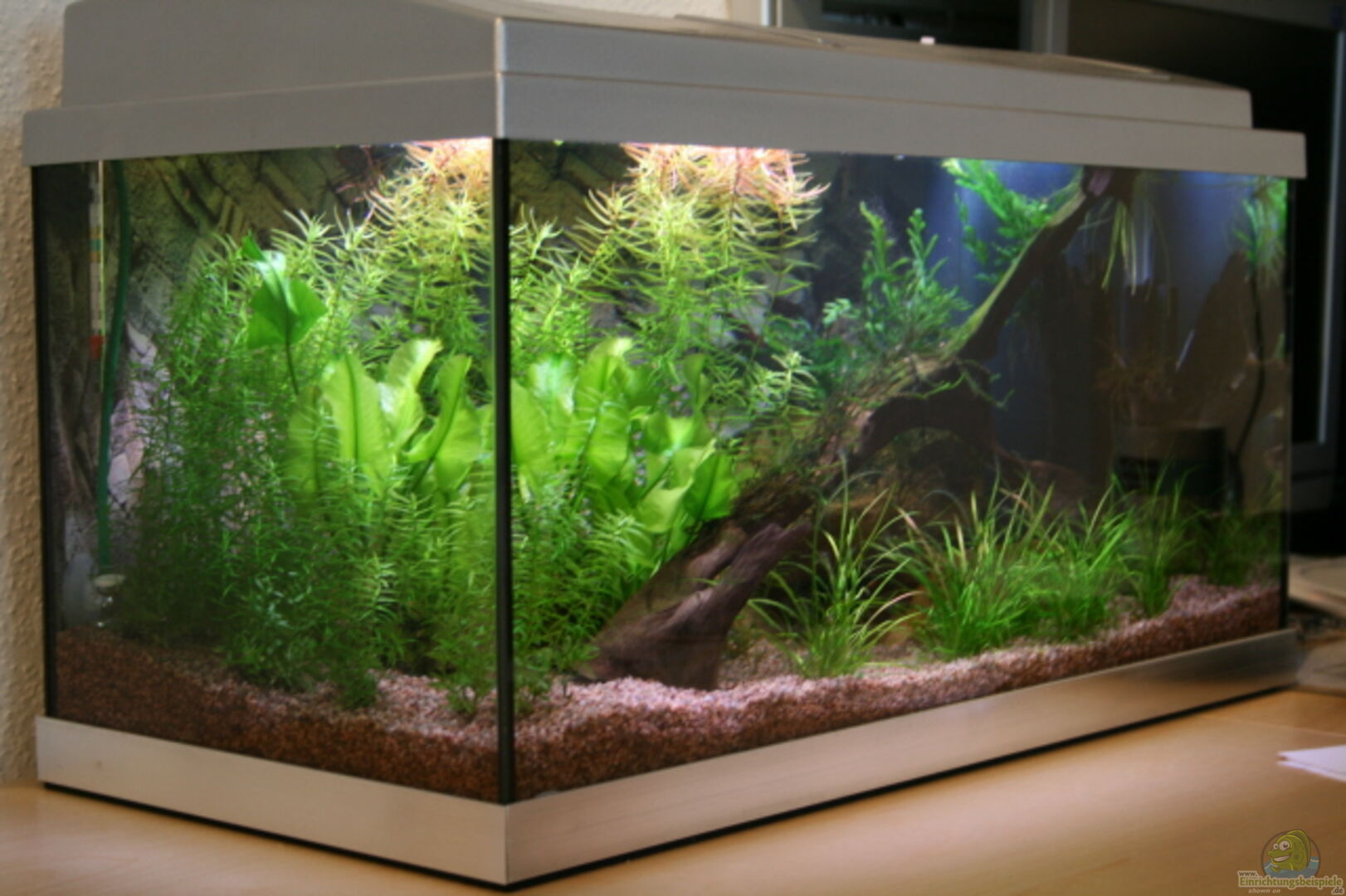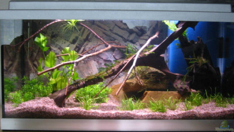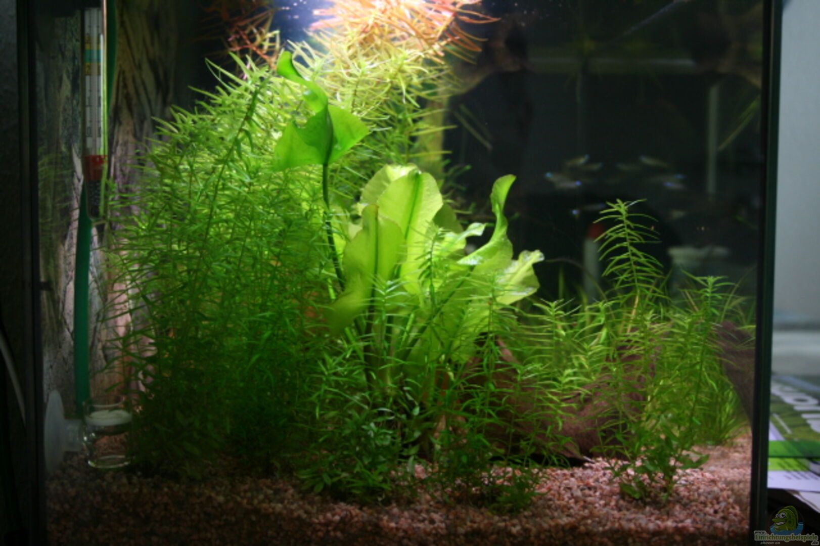 Sieht echt klasse aus Dein Kleines Becken. Hast Du noch andere und wenn ja sind diese auch hier reingestellt?Wenn ich Dir einen Tip geben darf, stell die Beleuchtung die Firma AquaGlo um und nehm die Lampe für Pflanzenwuchs dunkel. Das hat bei mir auch gewirkt gegen die Algen oder leg ein Stück Eichenholz rein.