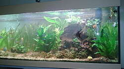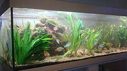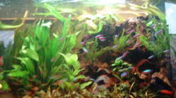 füllten wir den Nährboden ein, darüber den gemischten Kies.Füllten ein wenig Wasser ein und begannen mit dem einsetzen der Pflanzen und restlichem Befüllen des Beckens.Danach schalteten wir den Filter und Co2 Anlage ein.Nun warten wir bis das Wasser passt um unsere Fische umzusiedeln.