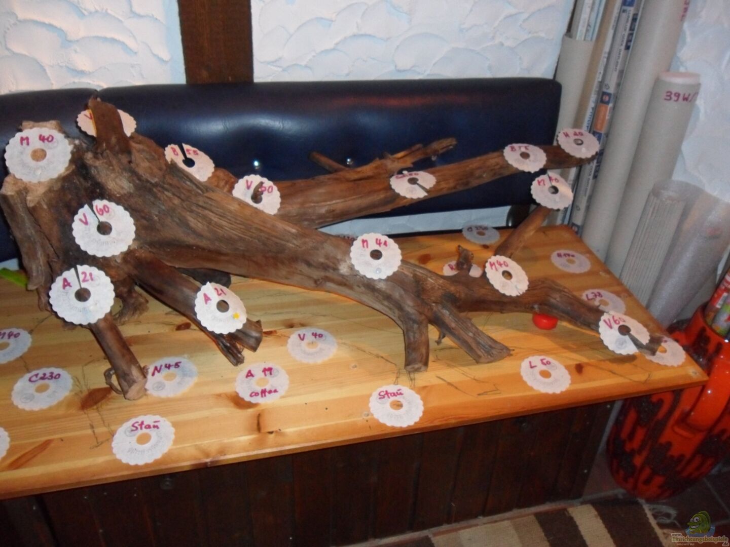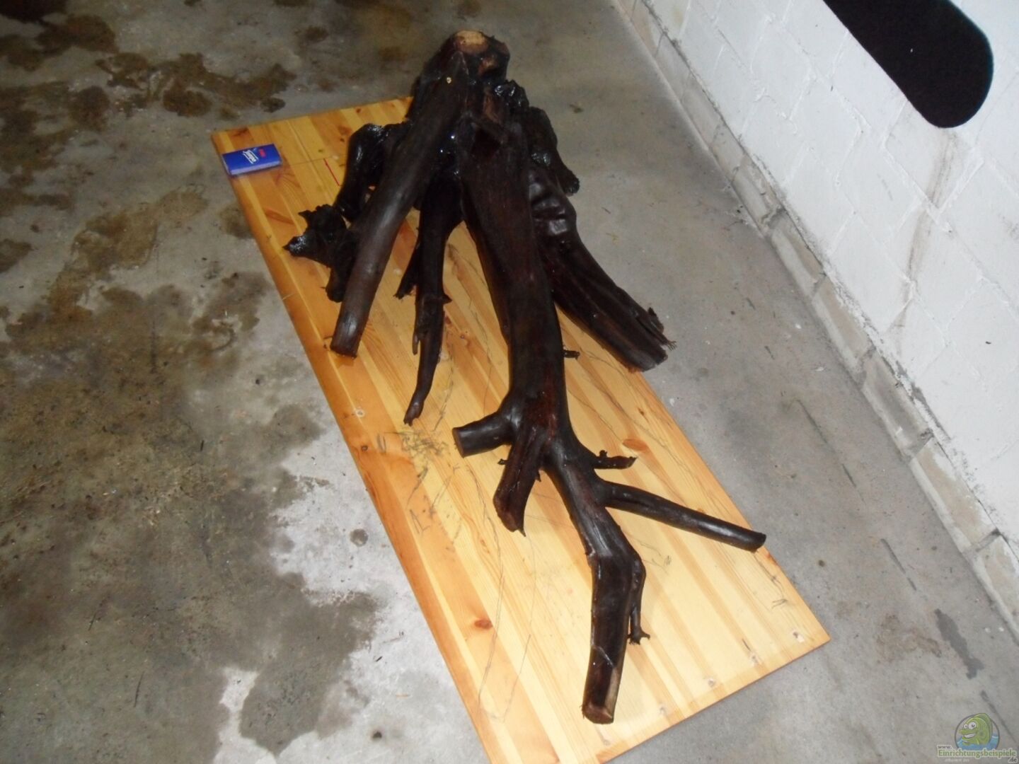Ich ersteigerte eine 115 cm lange und 27 kg schwere Moorkienwurzel, wie sie auf Bild 16 noch in ihrer ursprünglichen Grö??e zu sehen ist. Nach dem Einbringen ins Aq. stellte sich heraus, da?? bei der Breite des Holzes eine Bepflanzung des Umfeldes, wie sie mir vorschwebte, nicht durchführbar war. Also wurde der hintere der beiden Hauptäste abgesägt. Teile davon wurden links vorn angesetzt und sind teilweise auf den Bildern 20 folgende zu sehen. Der bullige Rumpf wurde ebenfalls verjüngt. Daran angesetzt wurde das hinterste Stück des vorderen Astes - siehe Bild 19. Nach erneuter Wiedereinbringung ins Aq. trieb der Moorkien immer noch auf und mu??te wiederum an zwei Stellen unter Verwendung von Granitsteinen gehalten werden. Er hat immer noch 17 kg Gewicht. Nachdem neu bepflanzt wurde konnten ca. 3 Wochen später die "Neuen" einziehen.
