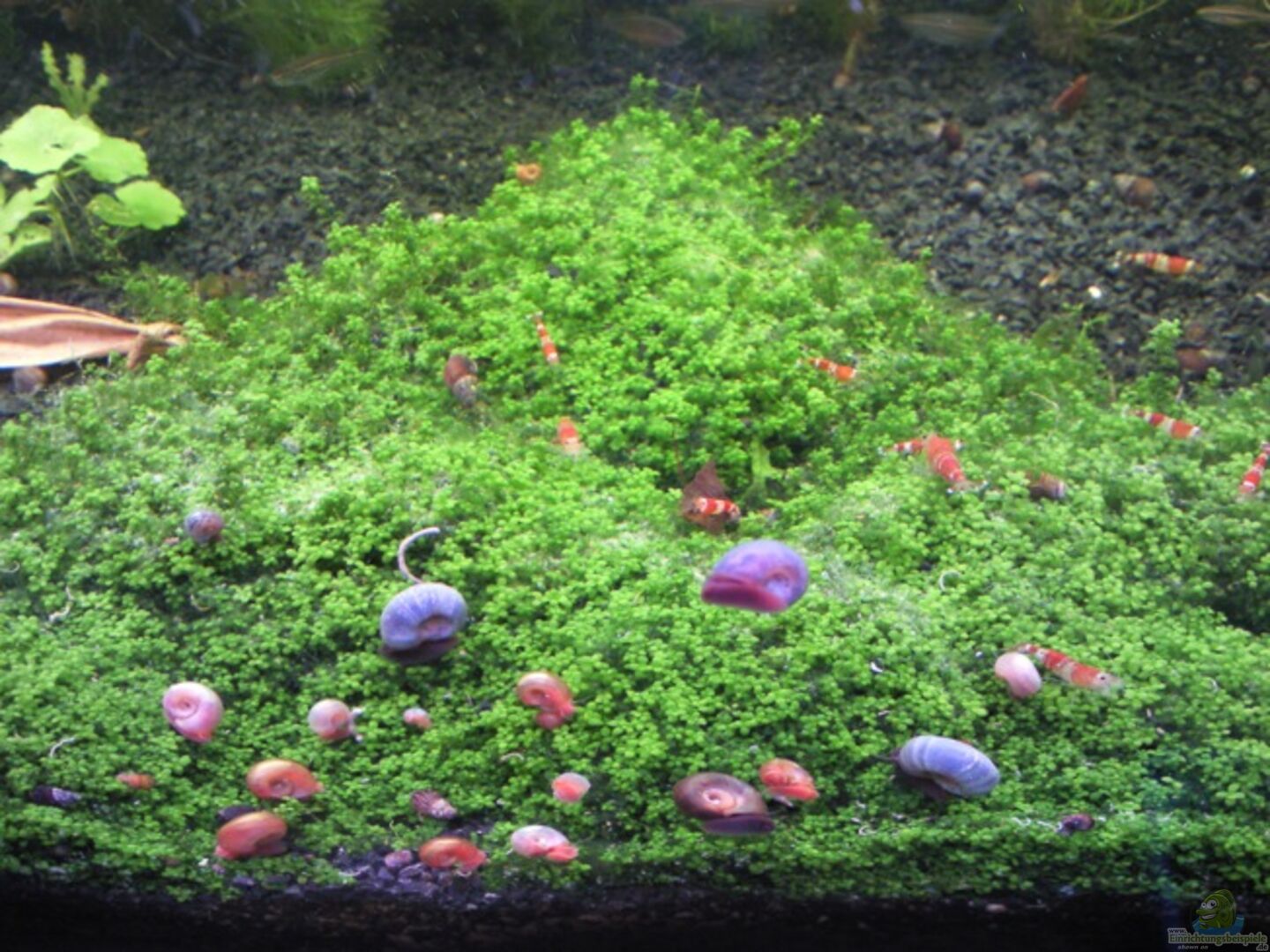 Posthornschnecken, div. Turmdeckelschnecken, Crystal Red Garnelen (ca 40 Stück, stetig steigend), 2 L144, 10 Danio margaritatus , sowie ein CPO Pärchen dessen Nachwuchs ich regelmä??ig abgebe (Weibchen wird zum Schluss der Tragezeit in ein Ablaichnetz gesetzt, der Nachwuchs in einem Extra Becken gro?? gezogen und nach Geschlechtern getrennt)