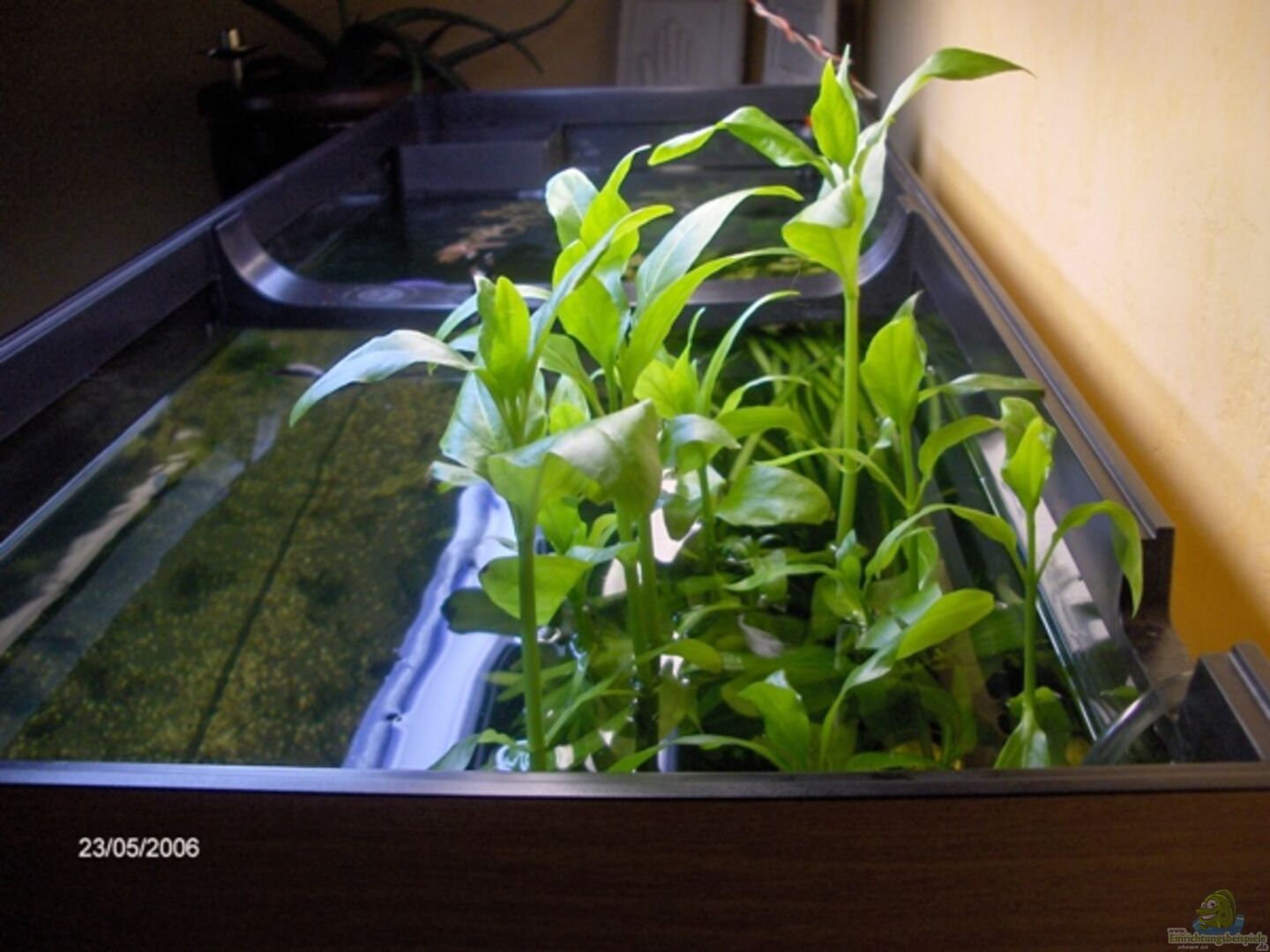 Wasserlinsen eingesetzt -> der Erffekt: entzieht dem Wasser Phosphat, Nitrit, Nitrat und die Grundlage für Algen. Wasserlinsen sind schnellstwachsend und ergeben einen hervorragenden Lichtfilter...