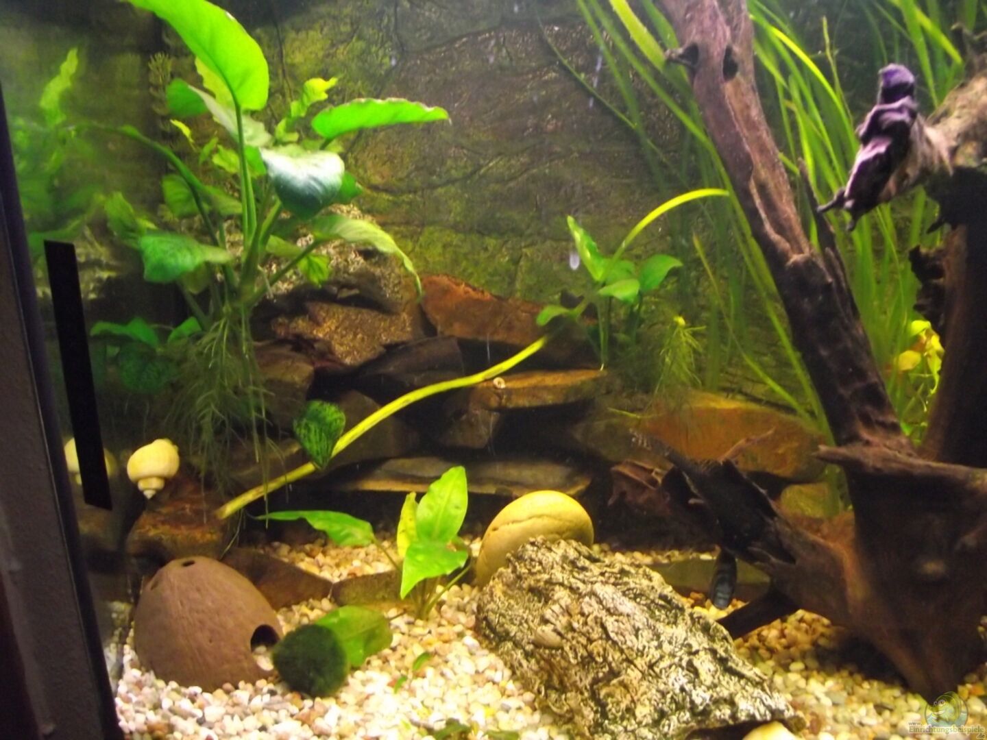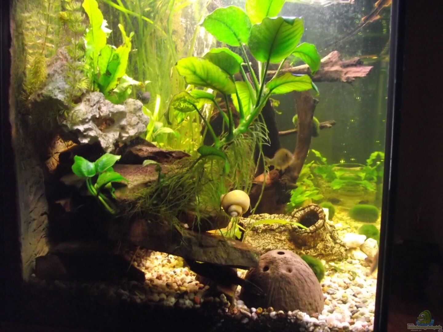 vor drei Wochen habe ich mein Becken neu gestaltet. Ich habe das Wasser wieder benutzt und auch die Einrichtung ist fast die selbe halt nur neu eingerichtet. Hier nun das Ergebnis.