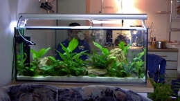 3 x 28 W T5 Leuchtstoffröhren von 11.00 Uhr bis 23.00 Uhr. Die Lichtfarbe kenne ich leider nicht, es ist noch die Originalbestückung der Leuchte ohne jeglichen ersichtlichen Hinweis. Von 22.45 Uhr bis 02.00 Uhr brennt noch eine blaue Kaltlichtkathode.