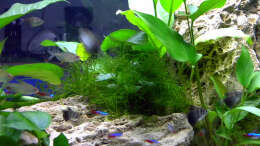 Heller Kies mit einer Körnung bis 5 mm. Da die Panzerwelse auf feineren Bodengrund verzichten müssen, soll so viel wie möglich von Moos überwachsen werden.
